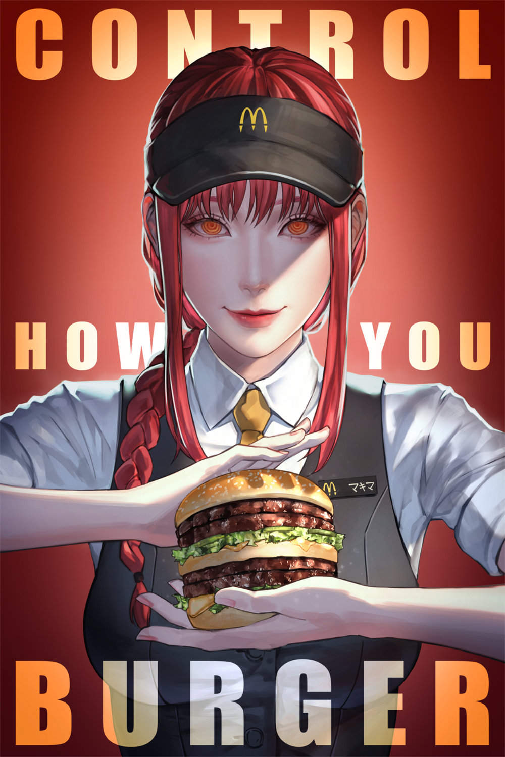 1girl braid brand_name_imitation burger chainsaw_man closed_mouth collared_shirt employee_uniform english_text fast_food_uniform food highres holding holding_food long_hair looking_at_viewer makima_(chainsaw_man) mcdonald's necktie orange_eyes parody red_hair shirt single_braid smile vest wandzardeen white_shirt yellow_necktie