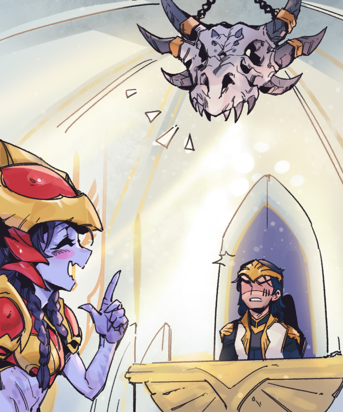 1boy 1girl :d alternate_costume armor black_hair black_shirt blush braid closed_eyes fang grin helmet jarvan_iv_(league_of_legends) league_of_legends long_hair long_sleeves open_mouth phantom_cross pointing pointing_up red_armor sharp_teeth shirt shyvana skin_fang skull smile surprised teeth twin_braids upper_body vest white_background white_vest