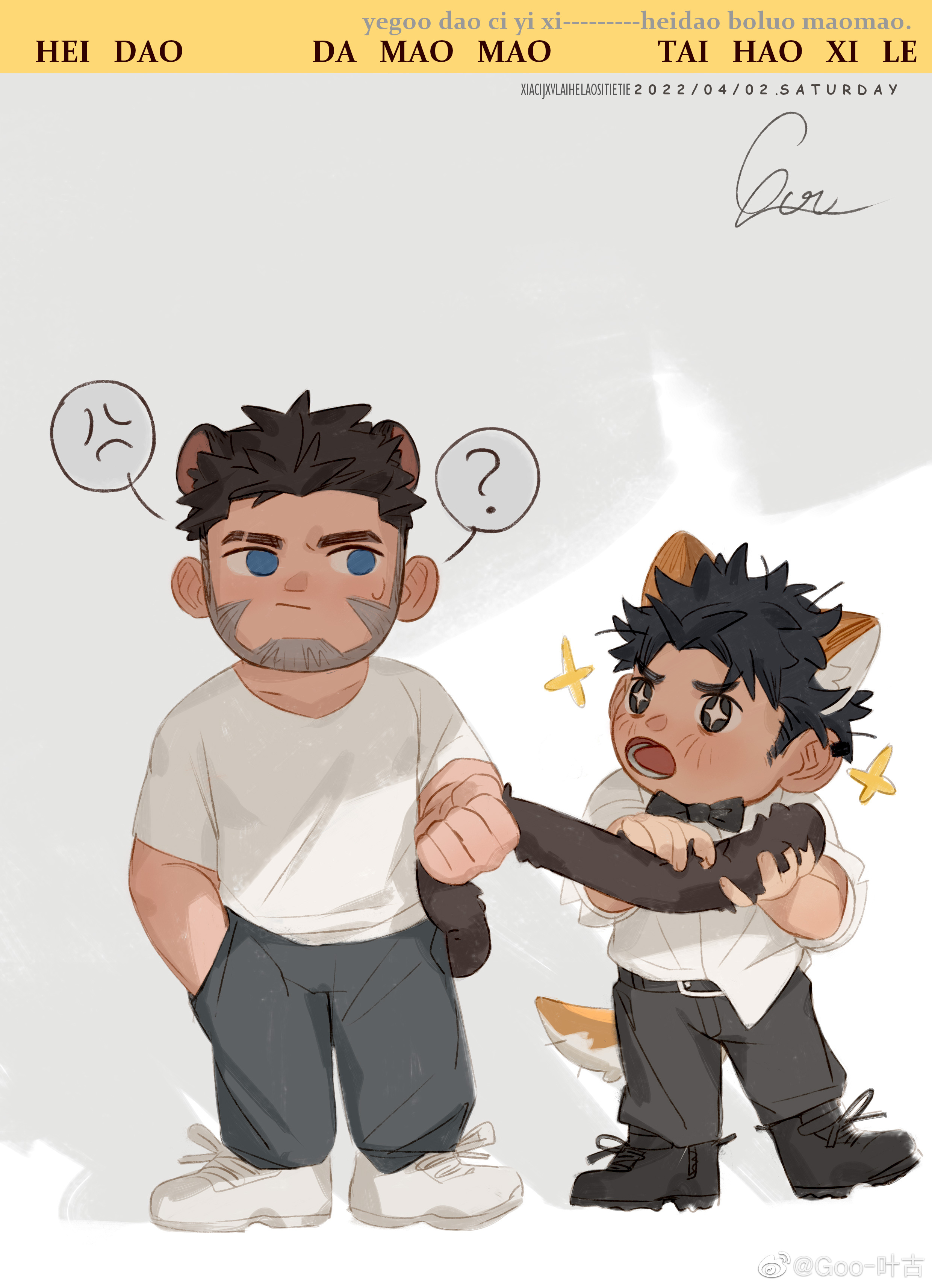 2boys ? absurdres anger_vein animal_ears annoyed bara beard black_hair blush borrowed_character cat_boy cat_ears deformed dog_boy dog_ears dog_tail facial_hair full_body goo_(koushishikou11) highres kuro_(kuroshima_kurishiro) male_focus mature_male multiple_boys original shirt shoes short_hair sideburns sneakers sparkle sparkling_eyes spoken_anger_vein spoken_question_mark standing tail tail_grab thick_eyebrows undercut