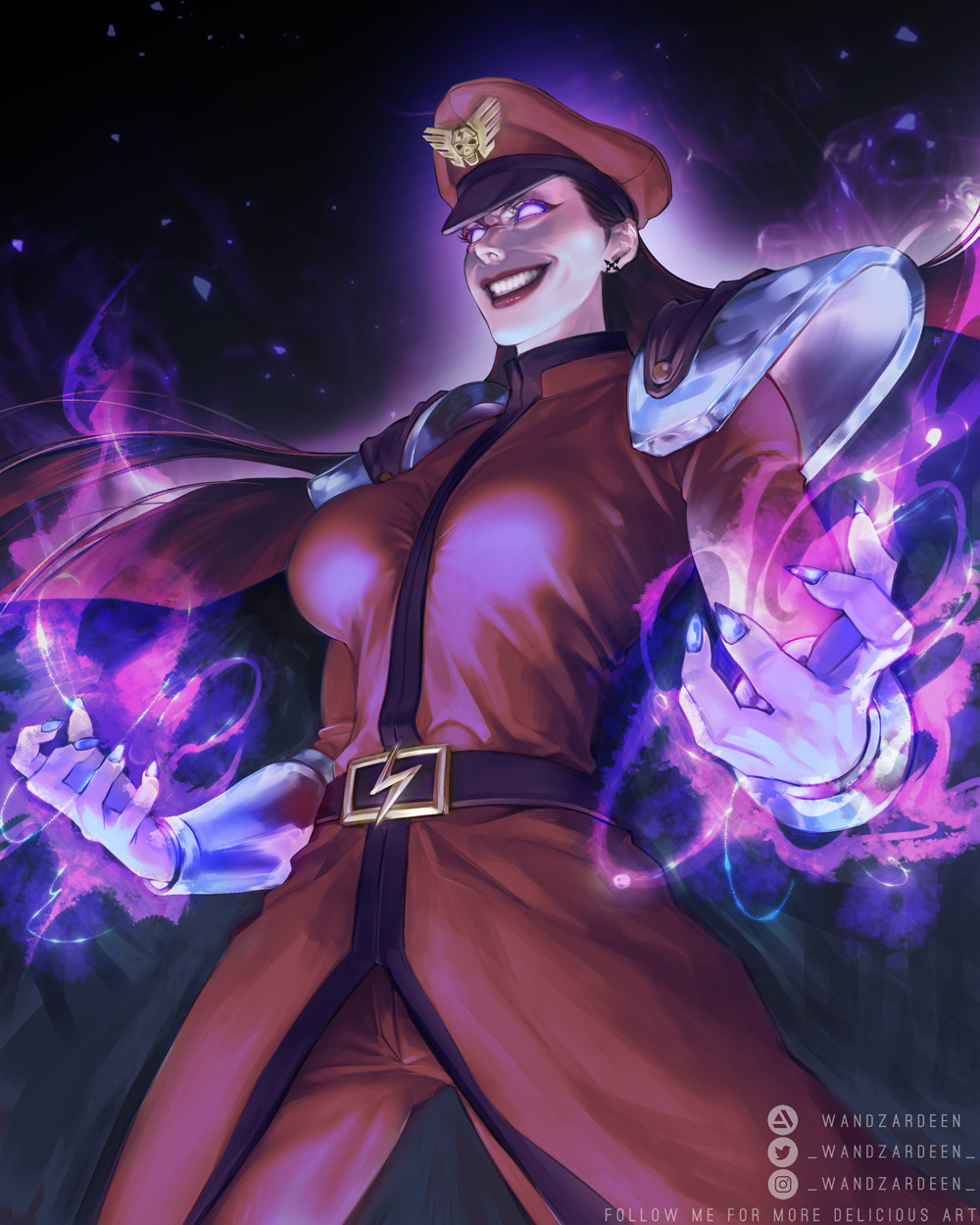 1girl armor aura belt black_hair capcom cape dark_aura earrings evil_grin evil_smile fingernails genderswap genderswap_(mtf) glowing glowing_eyes grin hat highres jewelry long_hair long_sleeves m._bison military military_hat military_uniform pauldrons red_hat red_lips school_uniform sharp_fingernails shoulder_armor smile solo street_fighter teeth wandzardeen