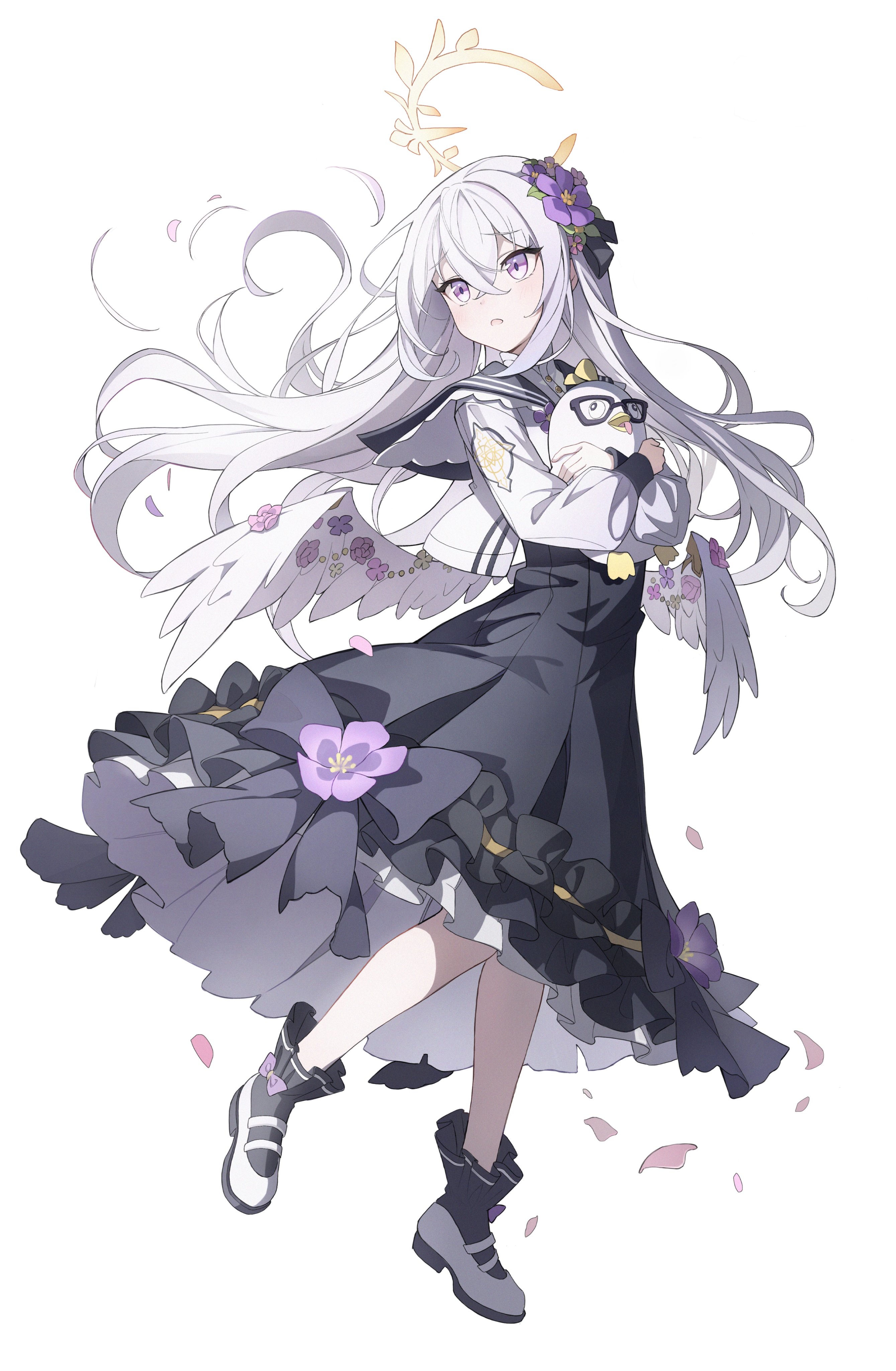 1girl absurdres angel_wings azusa_(blue_archive) black_dress black_ribbon black_sailor_collar black_socks blue_archive bow bow_legwear cherry_blossoms commentary crossed_bangs dress falling_petals feathered_wings flower frilled_dress frilled_socks frills full_body hair_between_eyes hair_flower hair_ornament hair_ribbon halo highres holding holding_stuffed_toy long_hair long_sleeves looking_to_the_side open_mouth peroro_(blue_archive) petals petticoat purple_bow purple_eyes ribbon sailor_collar shirt simple_background socks solo standing stuffed_animal stuffed_toy white_background white_footwear white_shirt white_wings wings yozisang