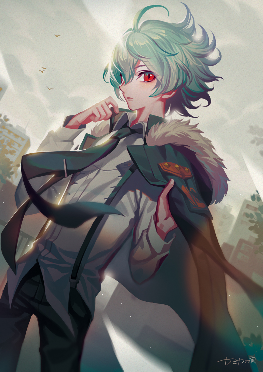 1boy aqua_hair bird black_jacket black_necktie black_pants cityscape collar_x_malice facing_to_the_side fur-trimmed_jacket fur_trim highres jacket jacket_on_shoulders kamikanomi long_sleeves looking_at_viewer male_focus necktie pants parted_lips red_eyes sasazuka_takeru shirt short_hair solo suspenders teeth white_shirt