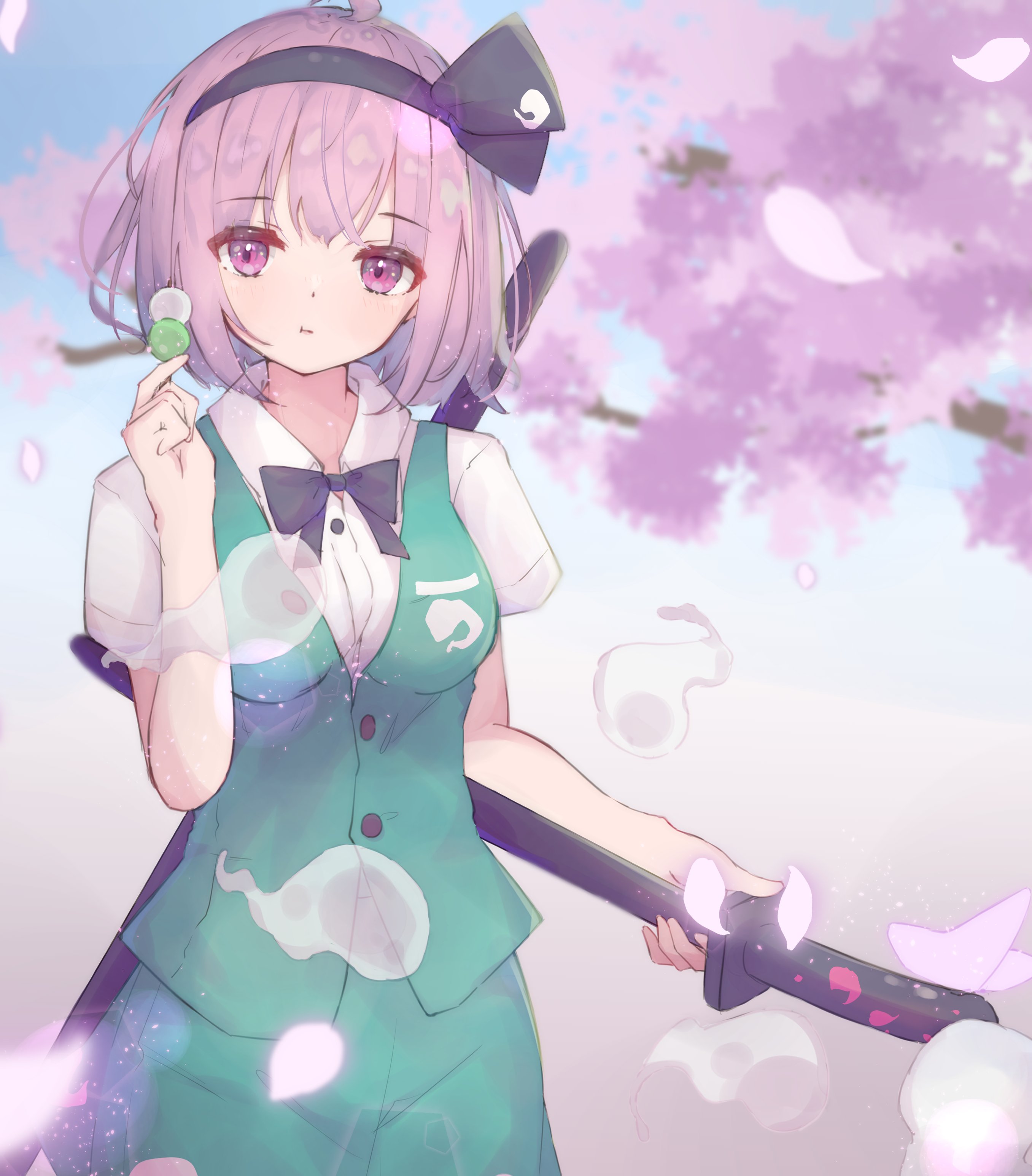 1girl absurdres black_bow black_bowtie black_hairband bow bowtie cherry_blossoms closed_mouth collared_shirt commentary_request cosplay dango food green_skirt green_vest hairband highres holding holding_manga holding_sword holding_weapon katana konpaku_youmu konpaku_youmu_(cosplay) looking_at_viewer manga_(object) matcha_yado outdoors pink_eyes pink_hair saigyouji_yuyuko sanshoku_dango shirt short_hair short_sleeves skirt solo sword touhou vest wagashi weapon white_shirt