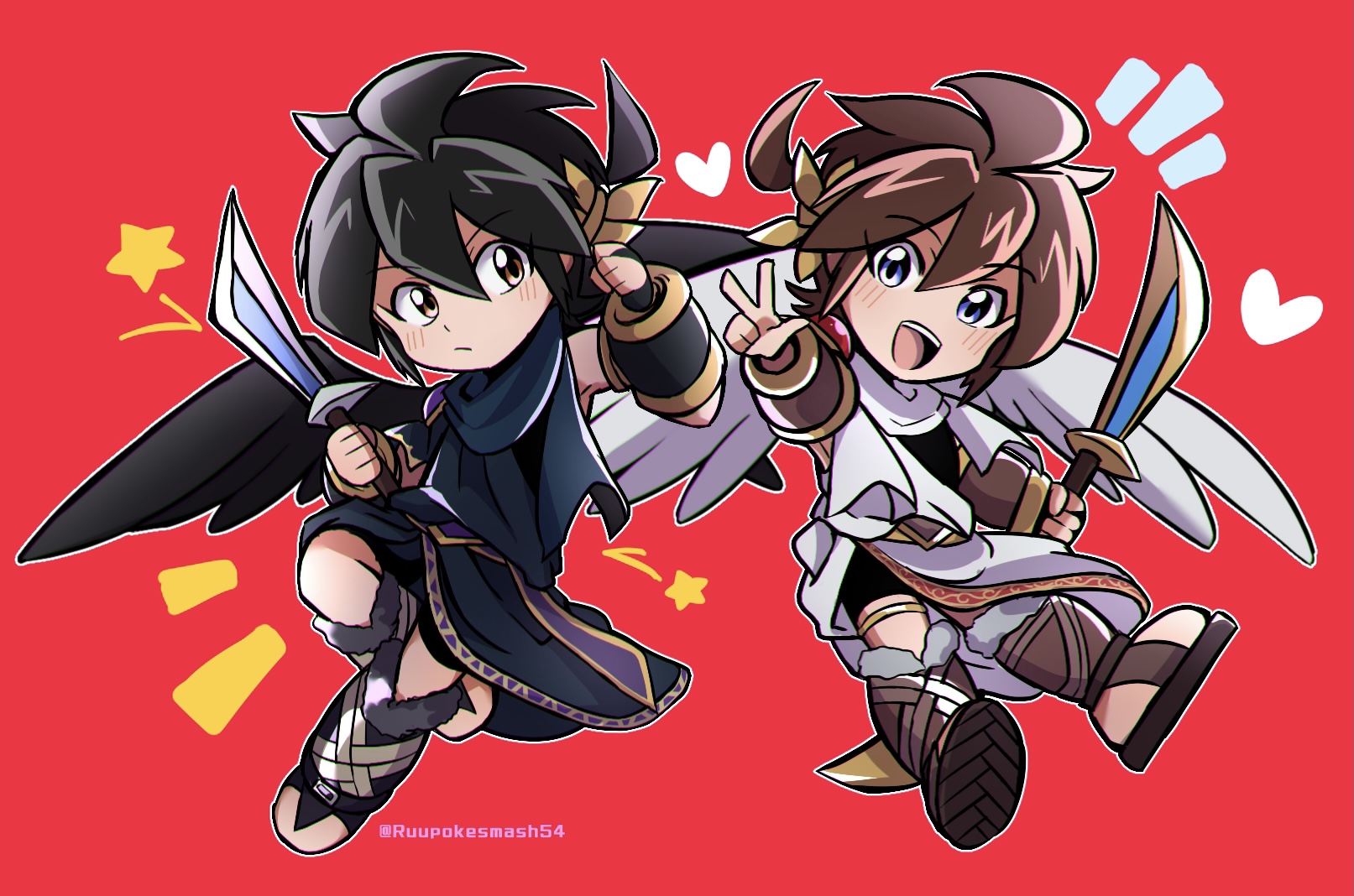 2boys angel angel_wings armband black_hair black_wings blue_eyes brown_hair chibi dark_pit feathered_wings heart highres kid_icarus kid_icarus_uprising laurel_crown light_blush looking_at_viewer multiple_boys nintendo open_mouth pit_(kid_icarus) red_background rune_(ruupokesmash54) siblings simple_background smile star_(symbol) twins twitter_username w white_wings wings