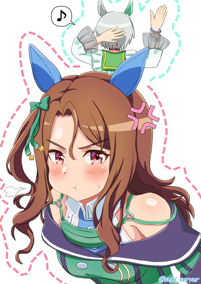 2girls :t anger_vein angry animal_ears artist_name bare_shoulders blush breasts brown_hair buttons double-breasted ear_covers facing_away gradient_eyes grey_hair horse_ears horse_girl king_halo_(king_of_emeralds)_(umamusume) king_halo_(umamusume) looking_at_viewer medium_breasts medium_hair multicolored_eyes multiple_girls pout puffy_sleeves pursed_lips seiun_sky_(reeling_in_the_big_one)_(umamusume) seiun_sky_(umamusume) seki_(hyokosho) short_hair speech_bubble twitter_username umamusume upper_body v-shaped_eyebrows wavy_hair