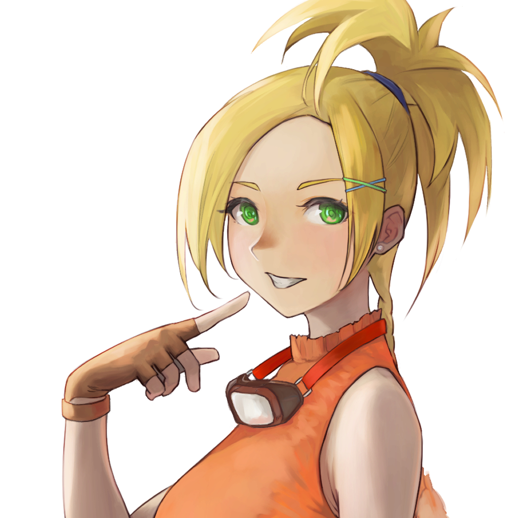 1girl blonde_hair braid breasts earrings final_fantasy final_fantasy_x fingerless_gloves gloves green_eyes hair_ornament jewelry keisanmisu long_hair looking_at_viewer medium_breasts rikku_(ff10) simple_background single_earring smile solo white_background x_hair_ornament