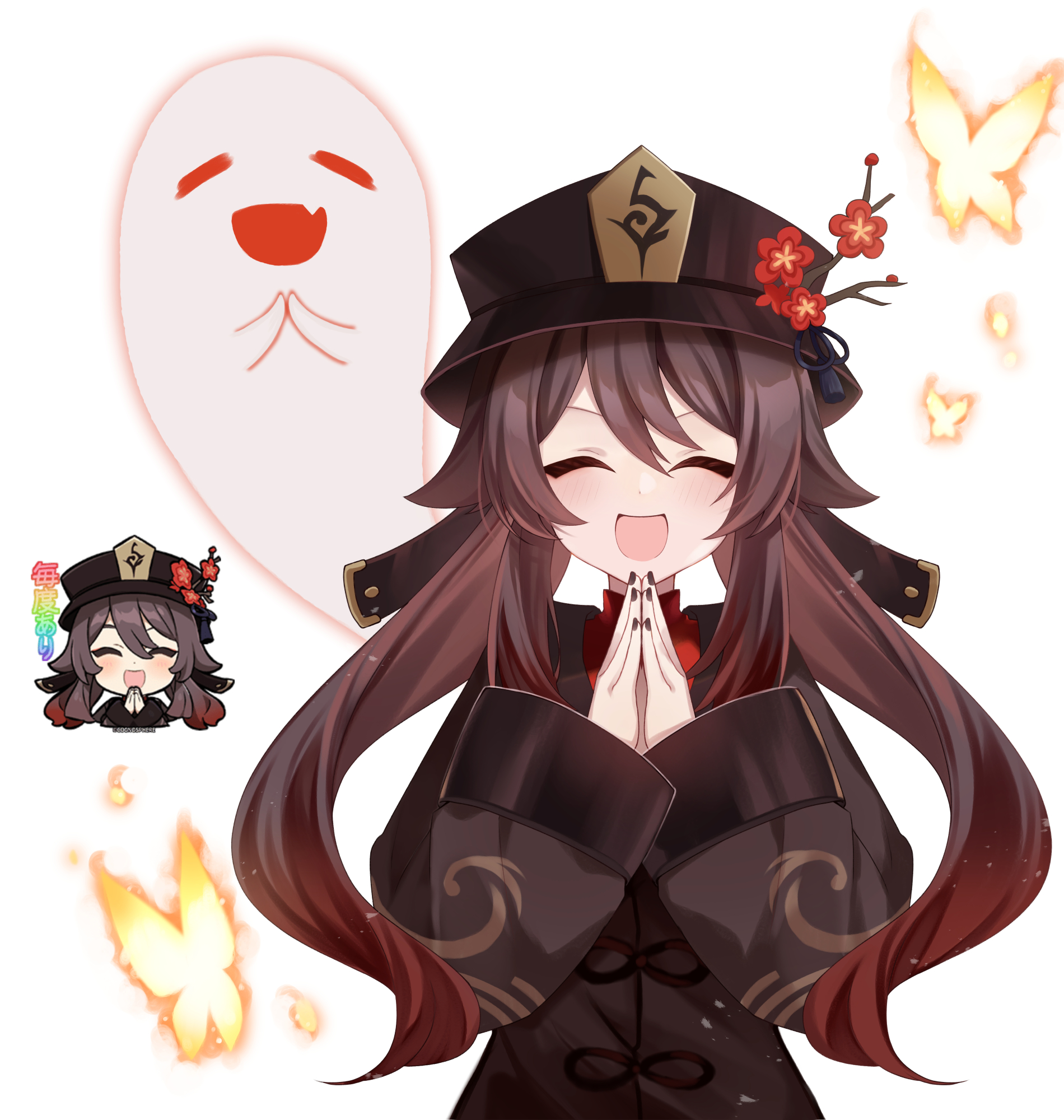 1girl black_nails blush brown_hair bug butterfly chibi closed_eyes genshin_impact hoyolab_sticker_redraw ghost happy hat highres hu_tao_(genshin_impact) insect looking_at_viewer ougi_(u_to4410) own_hands_together simple_background smile solo twintails white_background