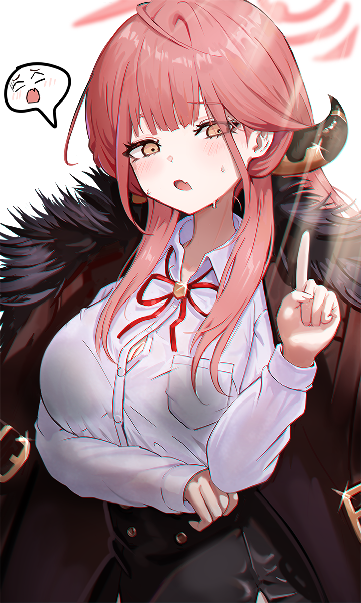1girl aru_(blue_archive) blue_archive blunt_bangs bow bowtie breast_pocket brown_coat coat coat_on_shoulders collared_shirt commentary_request demon_girl demon_horns eyes_visible_through_hair fur-trimmed_coat fur_trim halo highres horns long_hair long_sleeves looking_at_viewer moth1 open_clothes open_coat parted_lips pocket pointing pointing_up red_bow red_bowtie red_hair school_uniform shirt sidelocks simple_background solo spoken_expression white_background white_shirt yellow_eyes