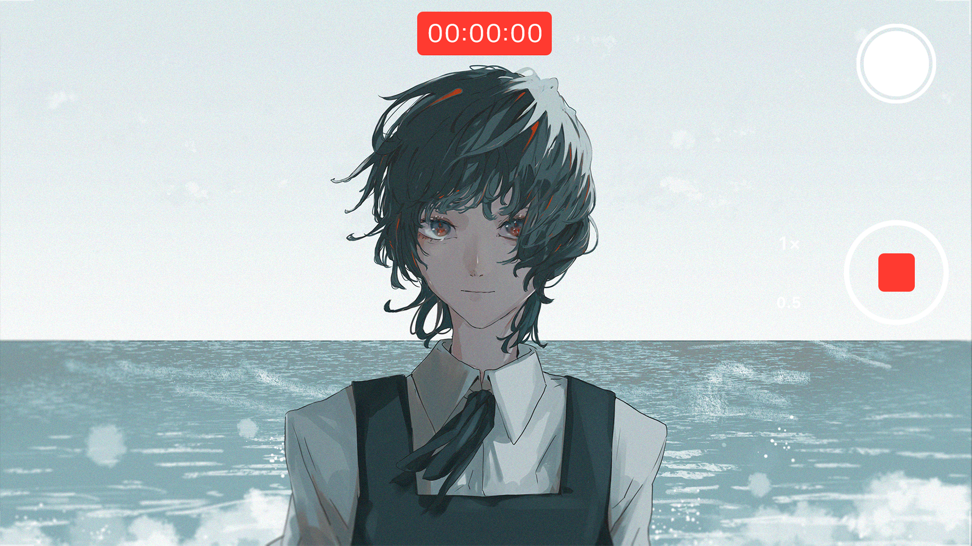 1girl arms_at_sides black_dress black_hair black_ribbon closed_mouth collared_shirt day dress eri_(sayonara_eri) grey_eyes highres horizon looking_at_viewer neck_ribbon ocean outdoors pinafore_dress ribbon sayonara_eri shirt short_hair sleeveless sleeveless_dress solo straight-on to/garashi upper_body viewfinder white_shirt wind