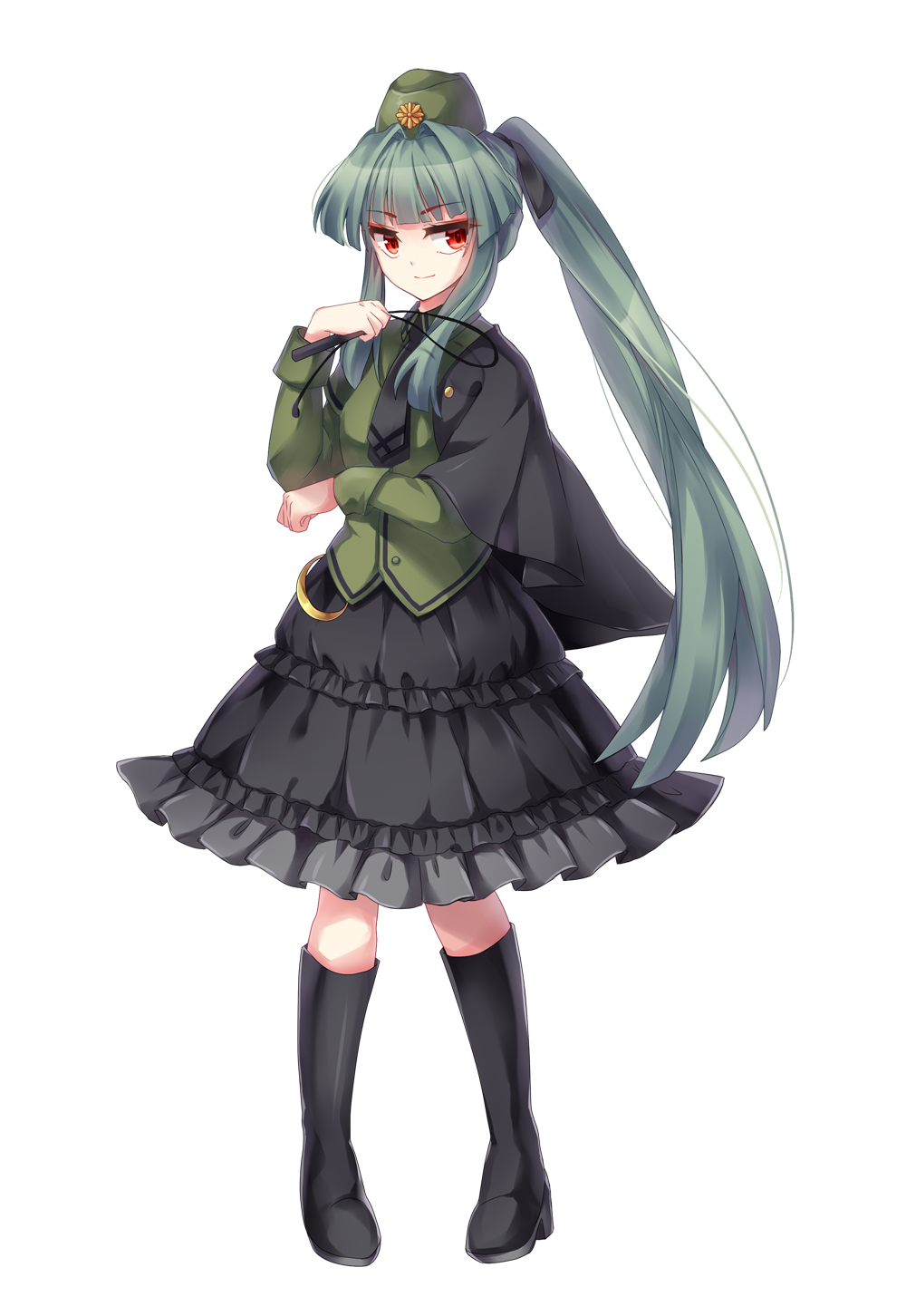 1girl akinomiya_asuka alternate_costume black_boots black_necktie black_skirt blunt_bangs boots breasts closed_mouth collared_shirt commentary_request frilled_skirt frills full_body green_hat green_shirt grey_hair hat highres long_hair long_sleeves medium_skirt mystical_power_plant necktie original ponytail red_eyes shirt simple_background skirt small_breasts smile solo suitokuin_tenmu tokin_hat touhou transparent_background