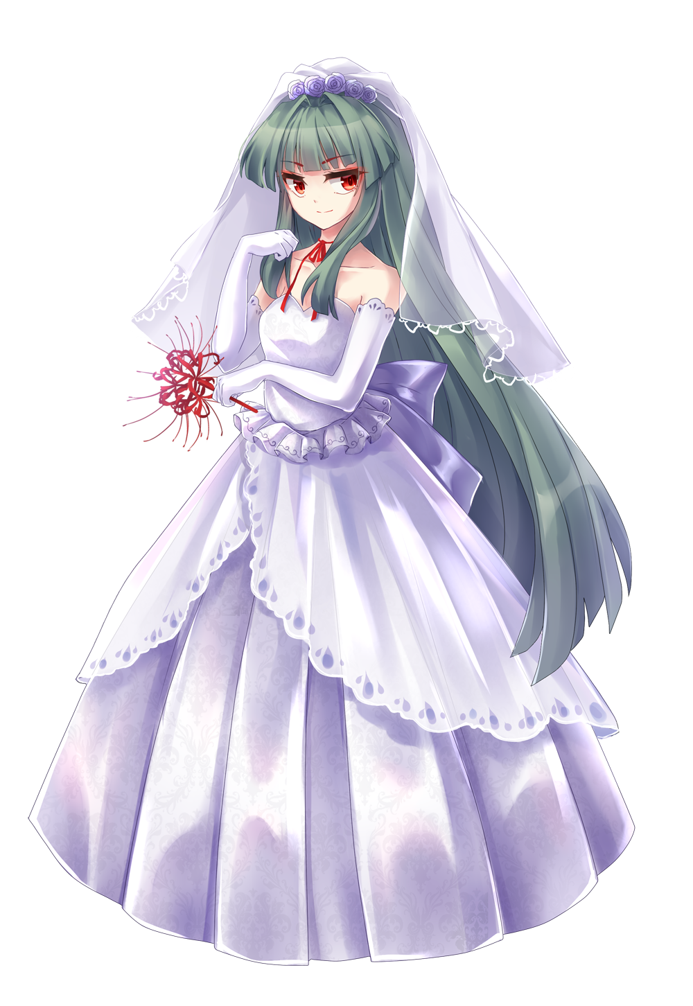 1girl akinomiya_asuka blunt_bangs breasts bridal_veil commentary_request dress elbow_gloves flower full_body gloves green_hair hair_down highres holding holding_flower long_dress long_hair mystical_power_plant original red_eyes red_flower ribbon simple_background small_breasts solo spider_lily strapless strapless_dress suitokuin_tenmu touhou transparent_background veil wedding_dress white_dress white_gloves white_ribbon white_veil