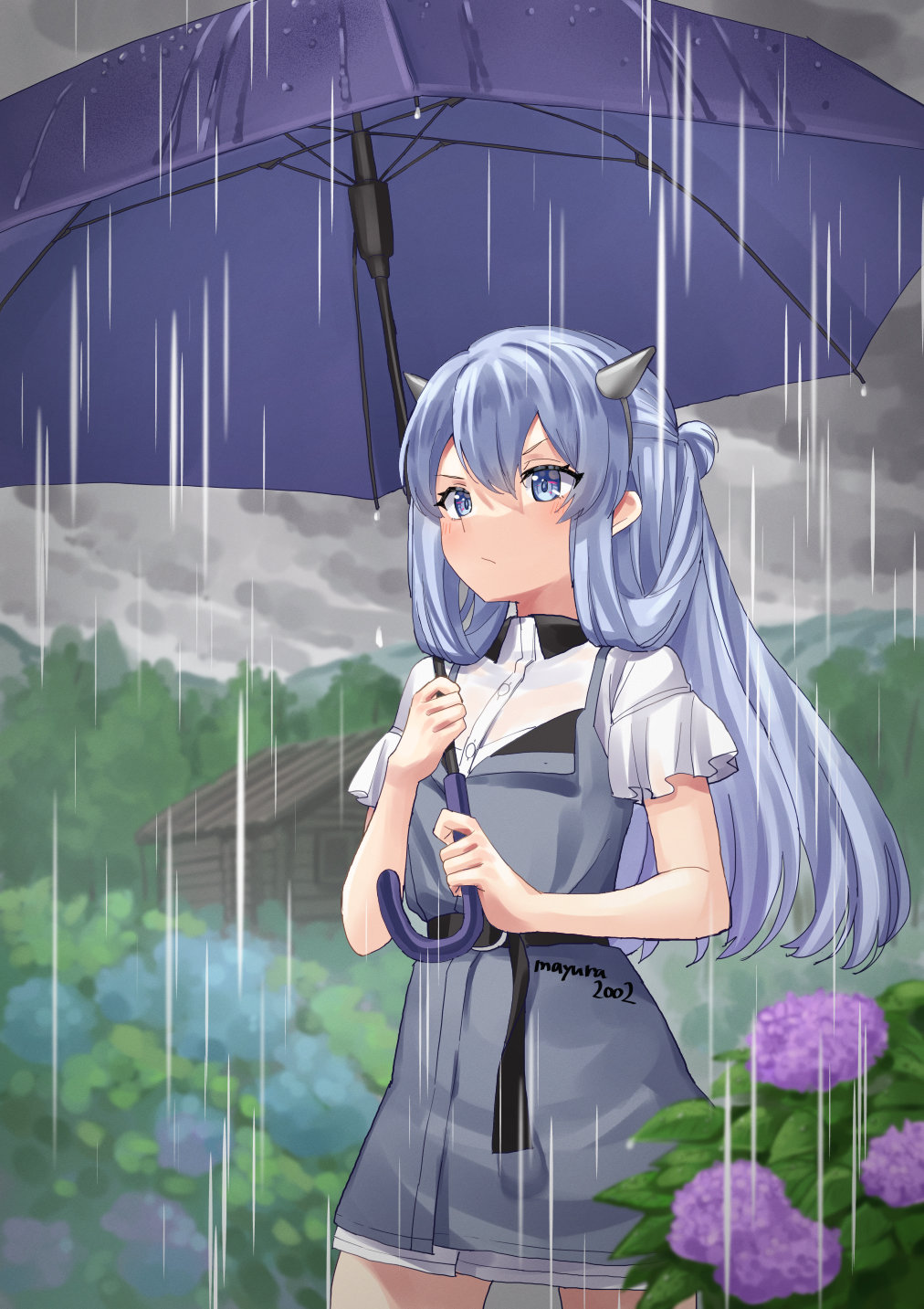 1girl blue_hair dress fake_horns flower frilled_sleeves frills grey_dress grey_hair headgear highres holding holding_umbrella horns hydrangea i-203_(kancolle) i-203_(rainy_season)_(kancolle) kantai_collection light_blue_hair long_hair looking_at_viewer mayura_(lucadia) nature outdoors rain shirt short_sleeves solo tree umbrella water_drop white_shirt