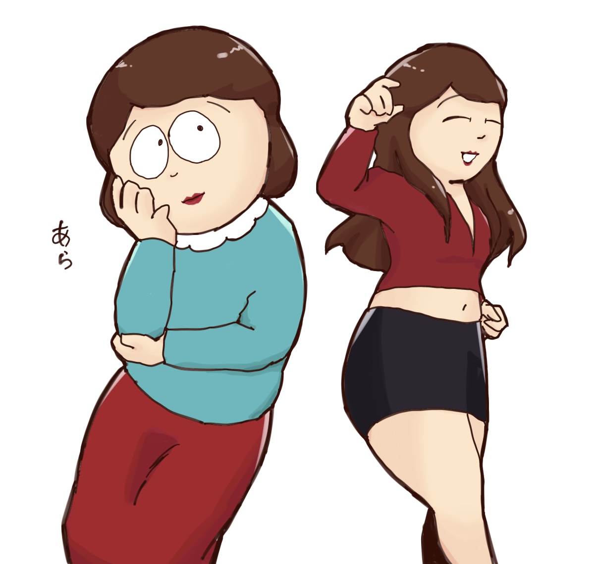 2girls aged_down alternate_costume black_skirt brown_hair dual_persona liane_cartman lipstick long_hair makeup midriff miniskirt multiple_girls simple_background skirt smile south_park white_background