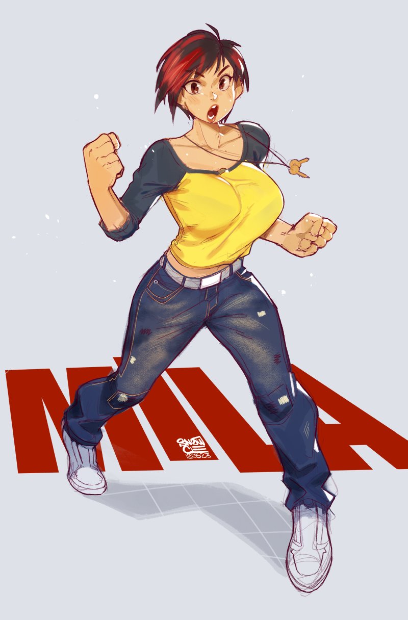 1girl belt breasts dead_or_alive denim highres jeans large_breasts mila_(doa) pants red_hair shoes short_hair short_sleeves snowcie tecmo