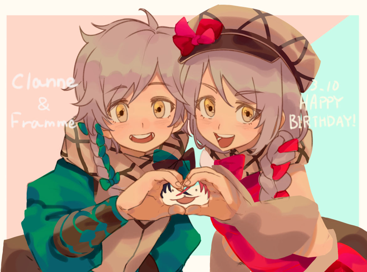 1boy 1girl braid brother_and_sister clanne_(fire_emblem) fire_emblem fire_emblem_engage framme_(fire_emblem) grey_hair hat hat_ribbon heart heart_hands heart_hands_duo jbeixu937jrhdk long_sleeves looking_at_viewer nintendo open_mouth ribbon siblings smile twins yellow_eyes