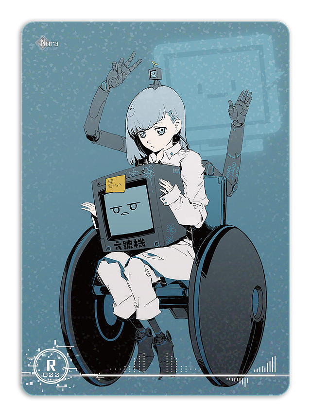 1girl artificial_legs artist_request blue_background blue_eyes blue_hair blue_theme bob_cut bright_pupils cable character_name chinese_text commentary crt cytus cytus_ii english_text expressionless frown full_body game_cg hair_ornament hairclip holding jitome looking_at_viewer looking_to_the_side mechanical_arms monitor nora_(cytus) object_on_head official_art pajamas prosthesis prosthetic_leg robo_head_(cytus) robot short_hair sitting solo sprout_on_head sticky_note technology third-party_source trading_card translated transparent_background v wheelchair white_pajamas white_pupils
