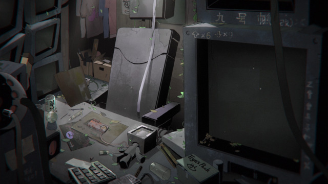 artist_request box broken cable can cardboard_box chair chinese_text circuit_board closet clutter commentary crt cytus cytus_ii dark day dirty drink drink_can english_text game_cg glass indoors laboratory leaf messy_room monitor no_humans office_chair official_art plant robot ruins screwdriver shirt snow_globe soda_can sticky_note swivel_chair t-shirt technology third-party_source tools translated unplugged unworn_shirt vines
