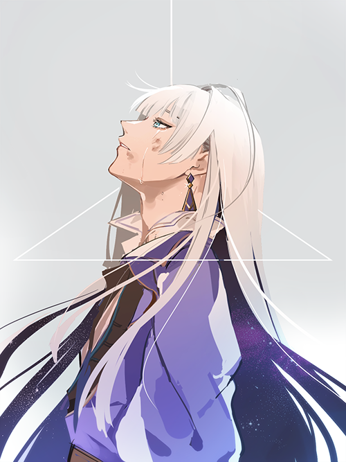 1boy blood blood_on_face blue_eyes blunt_bangs cassius_(granblue_fantasy) colored_inner_hair crying crying_with_eyes_open cunonn earrings floating_earrings from_side granblue_fantasy grey_background jacket jewelry long_hair looking_up male_focus multicolored_hair parted_lips popped_collar profile purple_hair purple_jacket shirt simple_background solo starry_hair tears triangle_earrings upper_body white_hair white_shirt