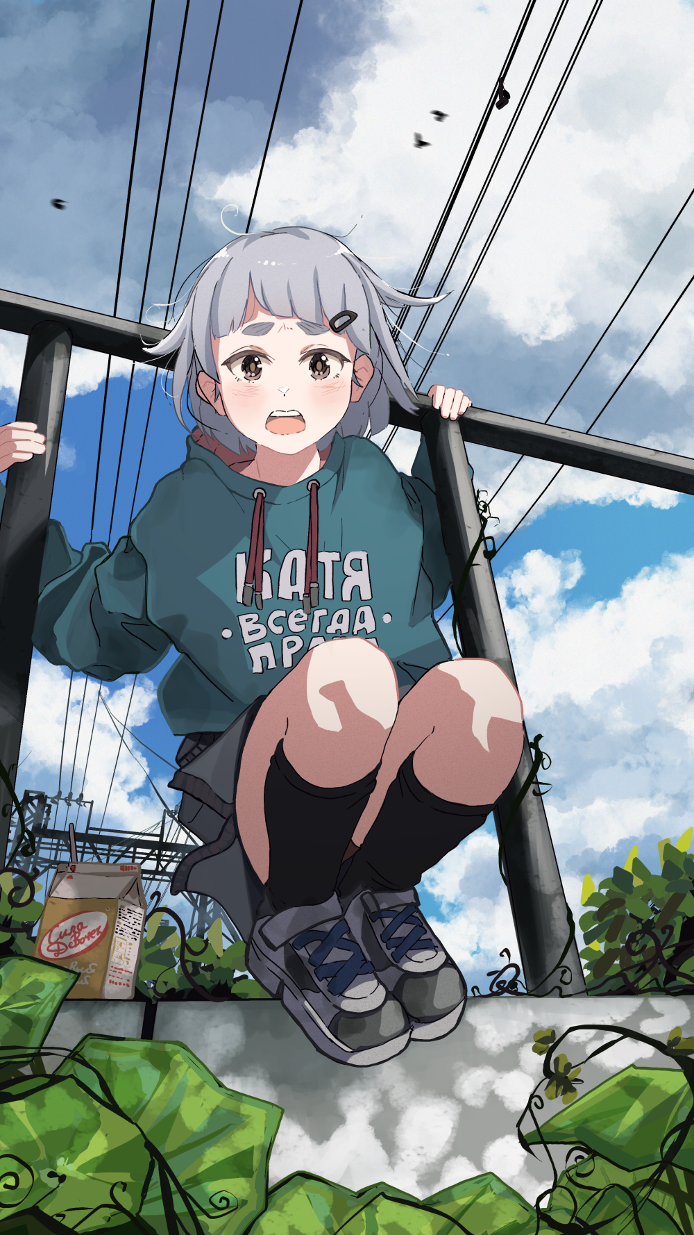 1girl aqua_hoodie bird black_socks blunt_bangs blush bob_cut brown_eyes casual cloud commentary cyrillic day drawstring drink_carton drinking_straw foliage from_below grey_hair grey_shoes grey_skirt hair_ornament hair_strand hairclip hand_on_railing highres hood hood_down hoodie katya_(servachok) looking_at_viewer messy_hair milk_carton open_mouth original outdoors plant power_lines railing russian_commentary russian_text scenery servachok shoes short_eyebrows short_hair skirt sky sneakers socks solo squatting thick_eyebrows translated vines