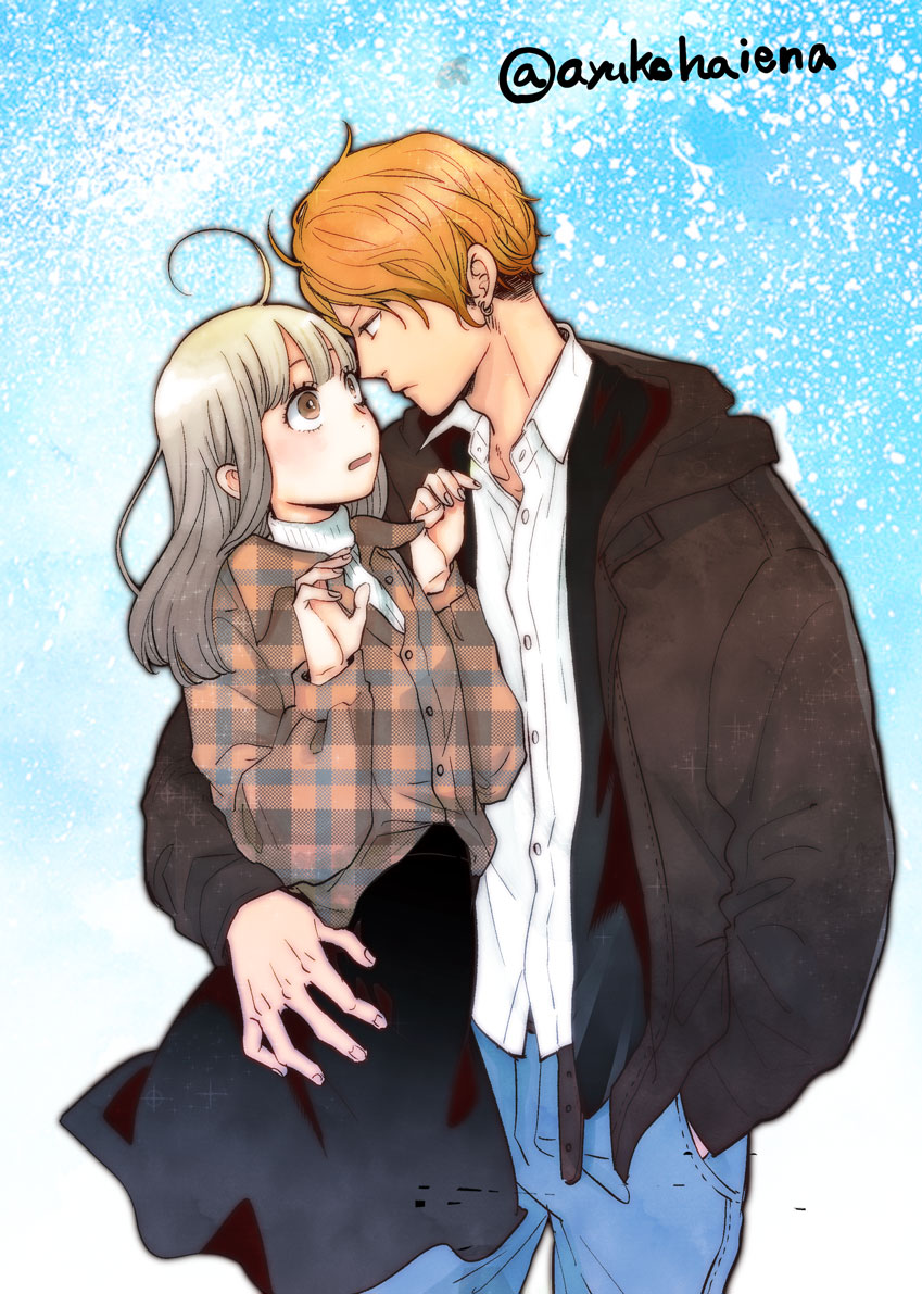 1boy 1girl ahoge black_jacket black_skirt blue_background blue_pants blunt_bangs blurry_edges bright_pupils brown_eyes brown_jacket brown_shirt buttons closed_mouth collared_shirt commentary_request couple cowboy_shot cropped_legs earrings fingernails frown gradient_background gradient_hair grey_hair hand_in_pocket hand_on_another's_thigh hatta_ayuko hetero hood hood_down hooded_jacket hoop_earrings ima_koi_wo_shiteimasu. jacket jewelry lapels layered_clothes long_hair long_sleeves looking_at_another looking_away looking_to_the_side mizusawa_satomi multicolored_hair multicolored_shirt nervous notched_lapels open_collar open_mouth orange_hair pants partially_unbuttoned plaid_clothes plaid_shirt shirt short_hair skirt sweater turtleneck turtleneck_sweater twitter_username unmoving_pattern white_background white_shirt white_sweater yagyuu_kazuma