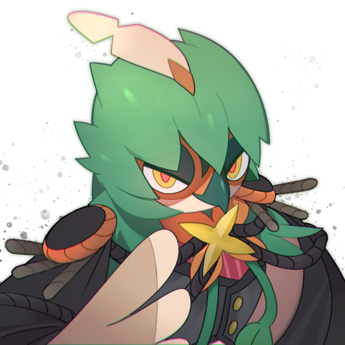 buttons closed_mouth clothed_pokemon commentary_request decidueye decidueye_(theater) gen_7_pokemon looking_at_viewer nintendo pink_pupils pokemon pokemon_(creature) pokemon_unite pokeradio solo upper_body vest white_background yellow_eyes