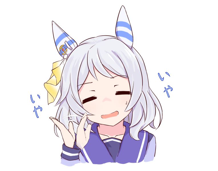 1girl =_= animal_ears blush closed_eyes collarbone commentary_request flapping grey_hair hair_ornament hishi_miracle_(umamusume) horse_ears horse_girl kk_tofu medium_hair open_mouth portrait school_uniform simple_background solo sweatdrop tracen_school_uniform umamusume white_background
