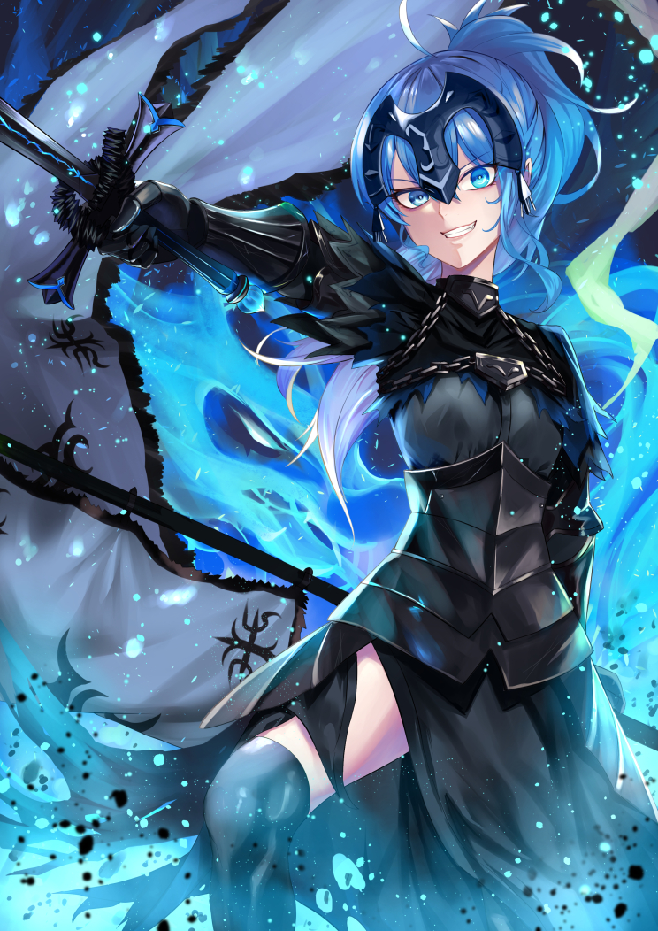 1girl ahoge armor blue_eyes blue_fire blue_hair chain cosplay fate/grand_order fate/stay_night fate_(series) fire flag flagpole gauntlets grin hololive hoshimachi_suisei jeanne_d'arc_alter_(avenger)_(fate) jeanne_d'arc_alter_(avenger)_(fate)_(cosplay) jeanne_d'arc_alter_(fate) long_hair looking_at_viewer parody ponytail smile solo sword virtual_youtuber weapon yellow_takano