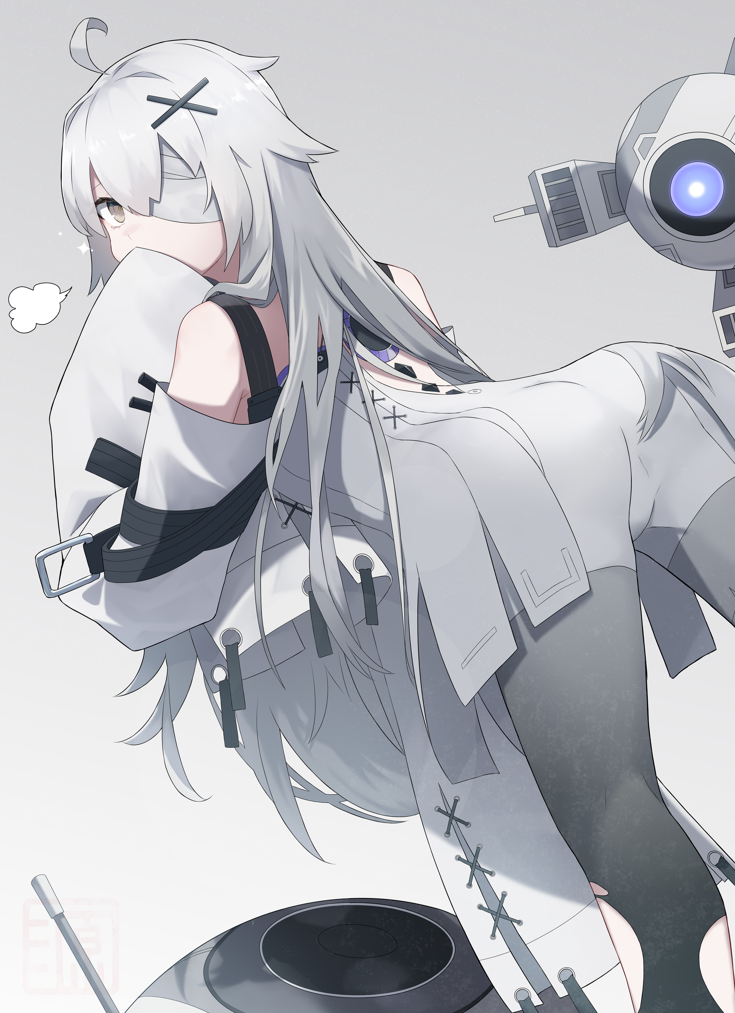1girl absurdres ahoge bandage_over_one_eye bare_shoulders berudora detached_sleeves dress grey_background grey_dress grey_eyes grey_hair grey_sleeves hair_ornament highres long_hair no._21:_xxi_(pgr) no._21_(pgr) non-humanoid_robot punishing:_gray_raven robot sidelocks sleeves_past_fingers sleeves_past_wrists subdermal_port suspenders torn_clothes very_long_hair x_hair_ornament