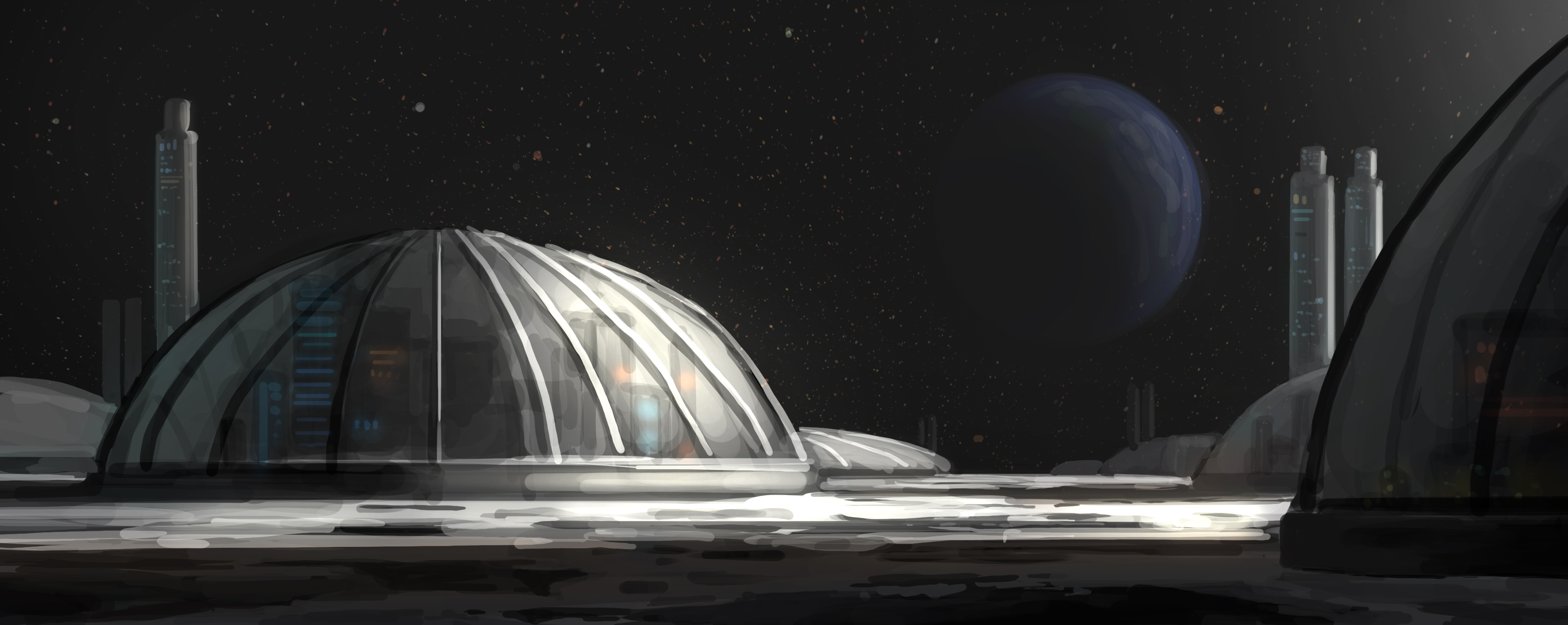 absurdres building city dome earth_(planet) highres meron_2770 moon no_humans original painting_(medium) planet scenery shadow skyscraper space star_(sky) sunlight traditional_media window