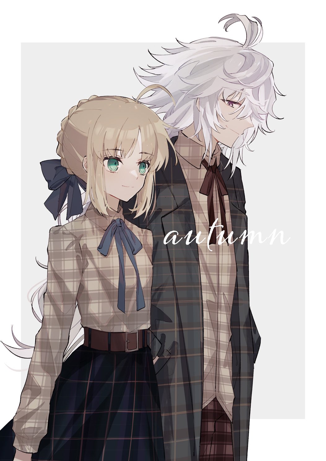 1boy 1girl ahoge alternate_costume artoria_pendragon_(fate) belt black_skirt blonde_hair blue_bow blue_coat blue_ribbon border bow braid braided_bun breasts brown_belt brown_pants brown_ribbon brown_shirt coat collared_shirt cowboy_shot english_text eye_contact fate/grand_order fate_(series) green_eyes grey_background hair_between_eyes hair_bow hair_bun hands_in_pockets highres long_bangs long_hair looking_at_another merlin_(fate) nayu_tundora neck_ribbon open_clothes open_coat outside_border pants parted_bangs plaid_clothes plaid_coat plaid_pants plaid_shirt plaid_skirt profile purple_eyes ribbon saber_(fate) shirt shirt_tucked_in sideways_glance single_hair_bun skirt small_breasts smile untucked_shirt white_border white_hair