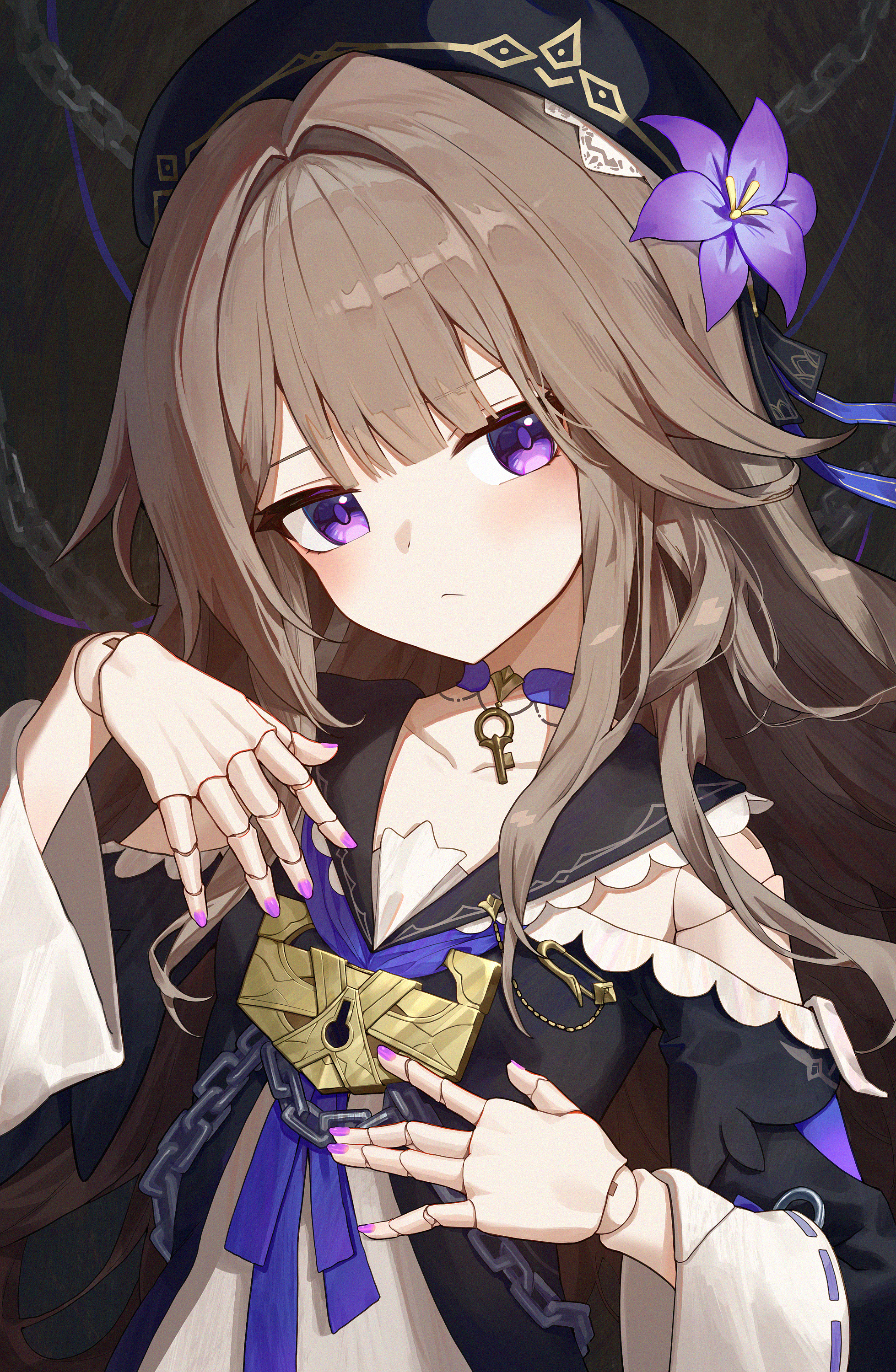 1girl absurdres beret black_dress closed_mouth commentary detached_sleeves doll_joints dress flower hair_flower hair_ornament hands_up hat herta_(puppet)_(honkai:_star_rail) highres honkai:_star_rail honkai_(series) joints light_brown_hair long_hair long_sleeves looking_at_viewer nail_polish pellas_(panix2383) purple_eyes purple_nails solo untranslatable_commentary upper_body white_hat