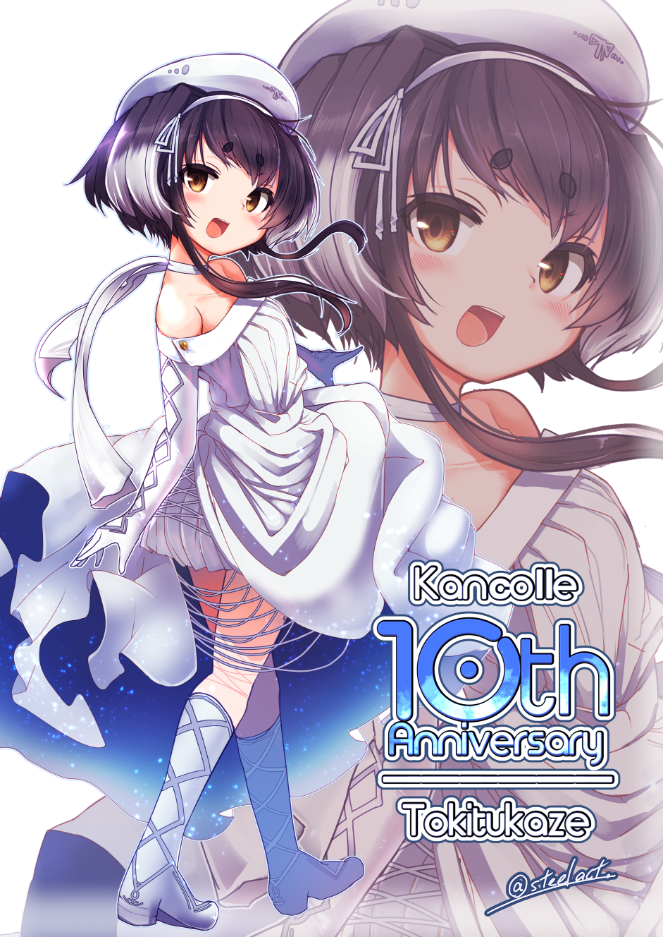 1girl alternate_costume anniversary beret black_hair boots brown_eyes dress elbow_gloves full_body gloves gradient_hair grey_hair hat highres kantai_collection looking_at_viewer looking_to_the_side multicolored_hair nijou_katame open_mouth short_hair short_hair_with_long_locks smile tokitsukaze_(kancolle) white_dress white_gloves yellow_eyes zoom_layer