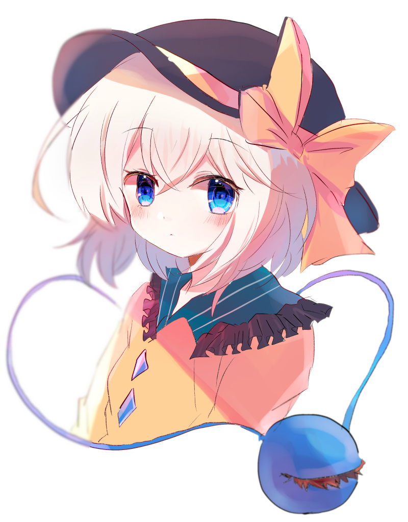 1girl black_hat blue_eyes blurry blush bow buttons closed_mouth commentary depth_of_field diamond_button dot_mouth dot_nose expressionless eyeball frilled_shirt frills from_side hat hat_ribbon heart heart_of_string ke-a-ru koishi_day komeiji_koishi long_sleeves looking_at_viewer one-hour_drawing_challenge orange_bow raised_eyebrows ribbon shirt short_hair sidelocks simple_background solo third_eye touhou upper_body white_background white_hair yellow_shirt
