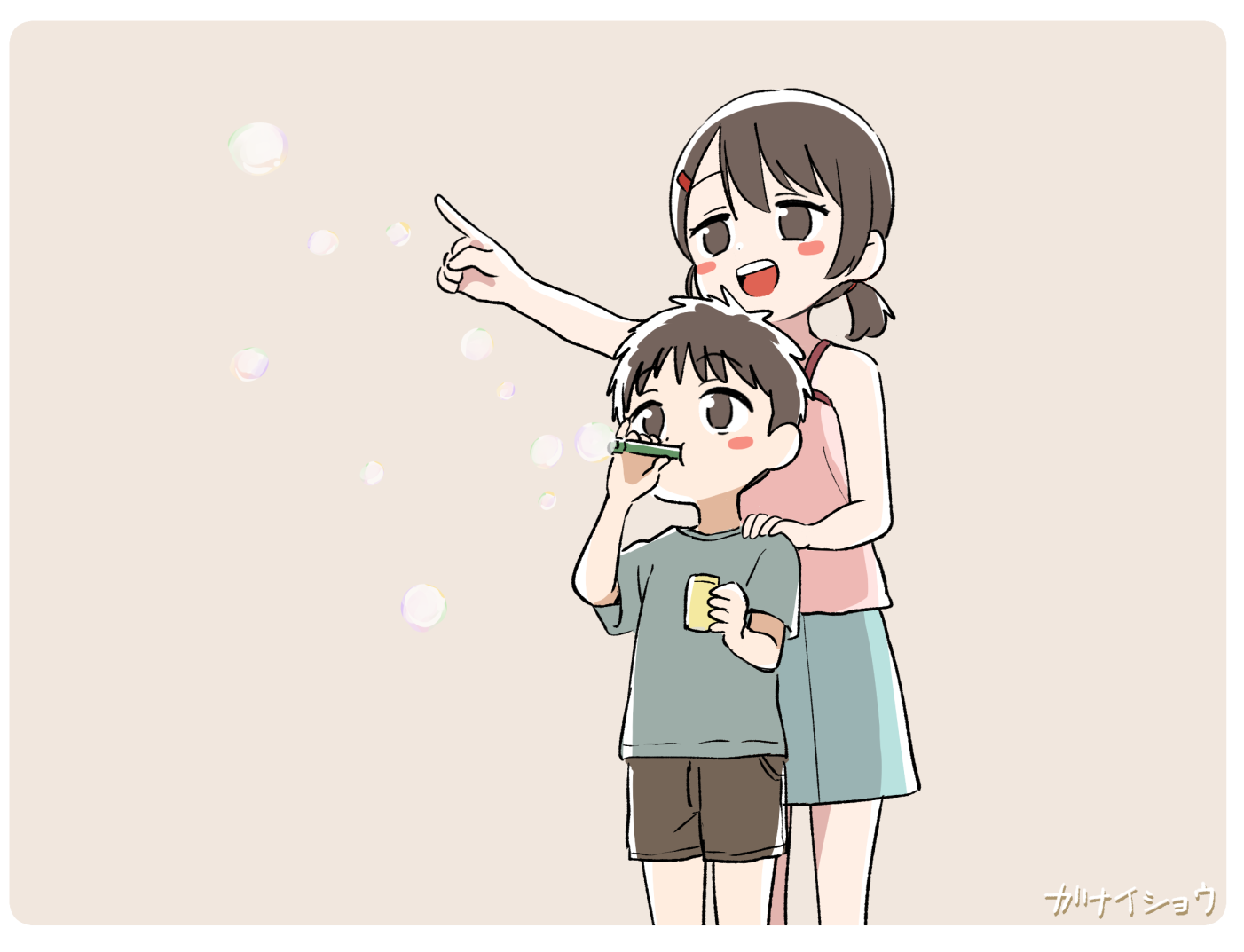 1boy 1girl age_difference aged_down black_eyes black_hair blowing_bubbles blush_stickers brother_and_sister child ganaishoten hair_ornament hairclip hand_on_another's_shoulder original pointing shirt short_twintails shorts siblings skirt standing t-shirt twintails