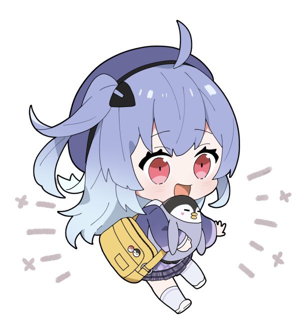 1girl 1other :d ahoge animal baby_animal bag beret bird blue_hair blush full_body goddess_of_victory:_nikke gradient_hair hat holding holding_animal hotata_te jacket multicolored_hair one_side_up open_mouth penguin penguin_chick plaid_clothes plaid_skirt purple_headwear purple_jacket rei_(nikke) school_bag school_uniform sidelocks simple_background skirt smile white_background yellow_bag