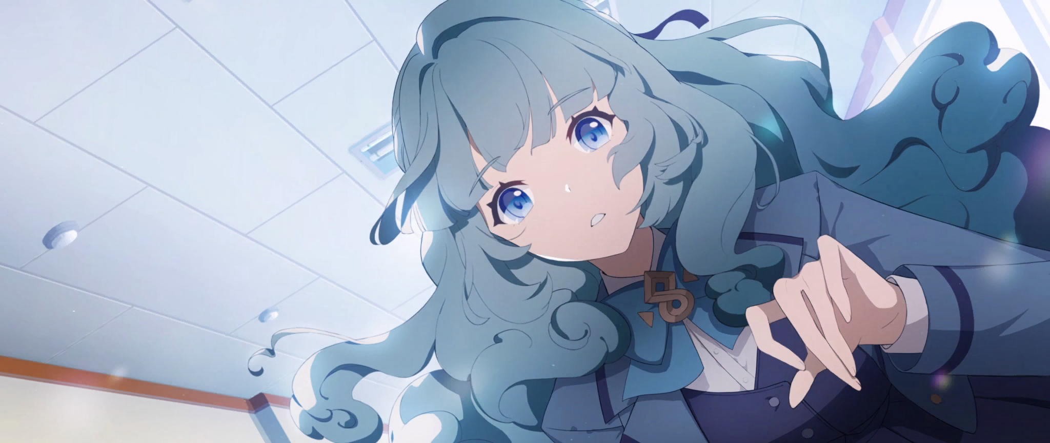 artist_request blazer blue_bow blue_eyes blue_hair blue_jacket blue_vest bow bowtie cloud_hair curly_hair eversoul game_cg hallway highres jacket long_hair looking_at_viewer non-web_source official_alternate_costume official_alternate_hairstyle official_art open_clothes open_jacket parted_lips school school_uniform shirt tagme third-party_source upper_body vest white_shirt yuria_(eversoul)
