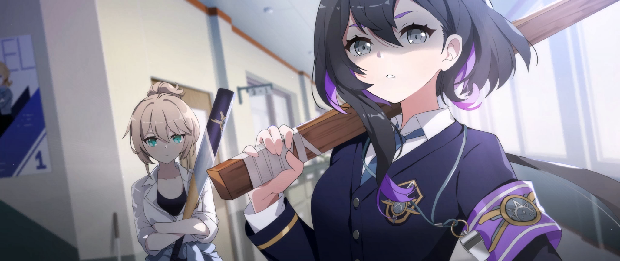 2girls artist_request baseball_bat black_hair black_jacket blue_eyes claire_(eversoul) claire_(no-hitter)_(eversoul) clothes_around_waist crossed_arms emblem eversoul game_cg grey_eyes hallway high_ponytail highres holding holding_baseball_bat holding_weapon jacket light_brown_hair linzy_(demerits)_(eversoul) linzy_(eversoul) looking_at_viewer multicolored_hair multiple_girls necktie non-web_source official_alternate_costume official_alternate_hairstyle official_art open_clothes open_shirt ponytail poster_(object) school school_uniform shaded_face sports_bra sweater sweater_around_waist sword third-party_source two-tone_hair upper_body weapon whistle whistle_around_neck wooden_sword