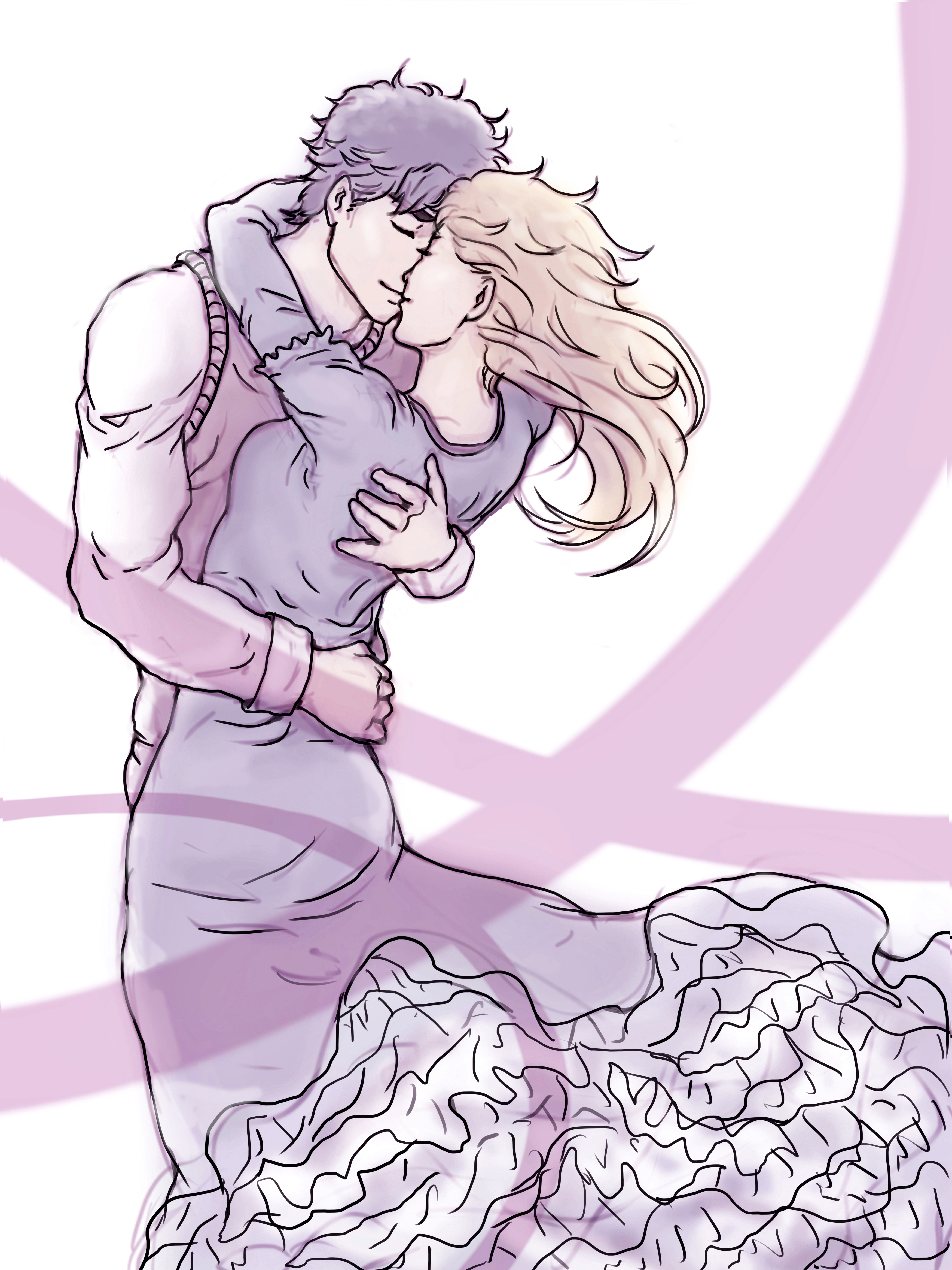 1boy 1girl absurdres blonde_hair blue_dress blue_hair breasts closed_eyes couple dress erina_pendleton hetero highres hug husband_and_wife iahme2 jojo_no_kimyou_na_bouken jonathan_joestar kiss long_hair long_sleeves medium_breasts phantom_blood shirt short_hair vest