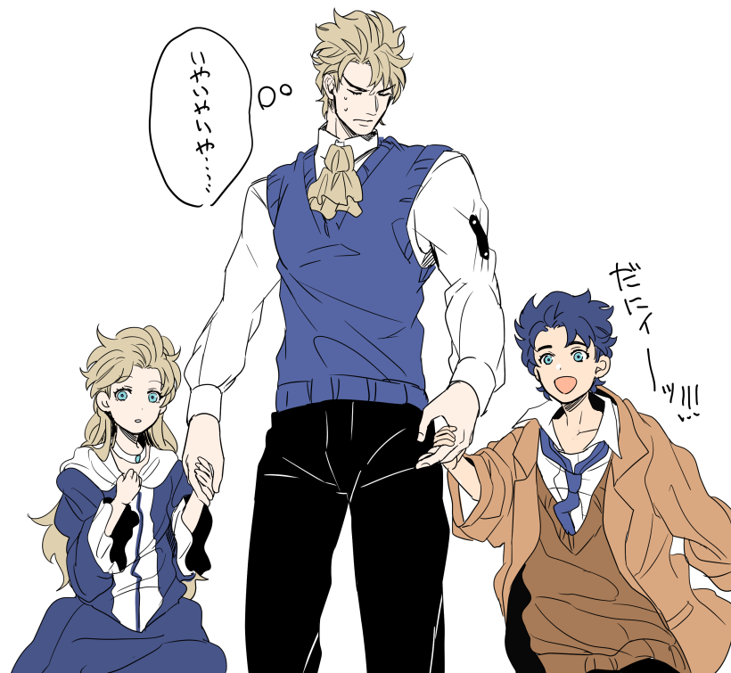 1girl 2boys age_regression aged_down black_pants blonde_hair blue_dress blue_eyes blue_hair dio_brando dress erina_pendleton holding_hands jojo_no_kimyou_na_bouken jonathan_joestar multiple_boys open_mouth pants phantom_blood smile speech_bubble sweatdrop takashi_(huzakenna) thought_bubble translation_request