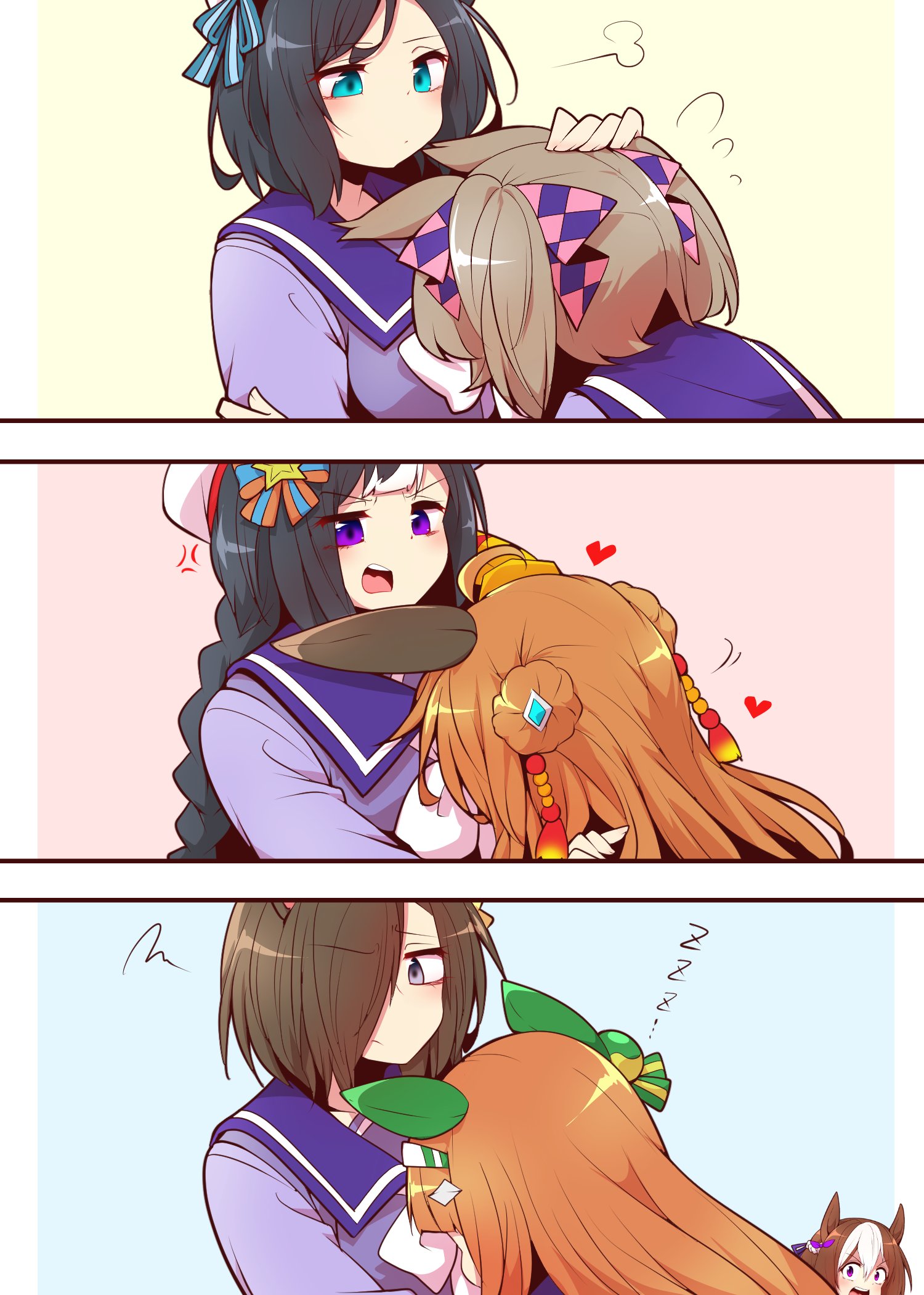 3koma 6+girls agemasen!_(meme) air_groove_(umamusume) animal_ears annoyed beret black_hair brown_hair closed_mouth comic commentary_request copano_rickey_(umamusume) double_bun eishin_flash_(umamusume) hair_bun hair_over_one_eye hat head_on_chest highres hokko_tarumae_(umamusume) horse_ears long_hair looking_at_viewer medium_hair meme multiple_girls orange_hair school_uniform silence_suzuka_(umamusume) smart_falcon_(umamusume) special_week_(umamusume) tracen_school_uniform umamusume yonedatomo_mizu zzz