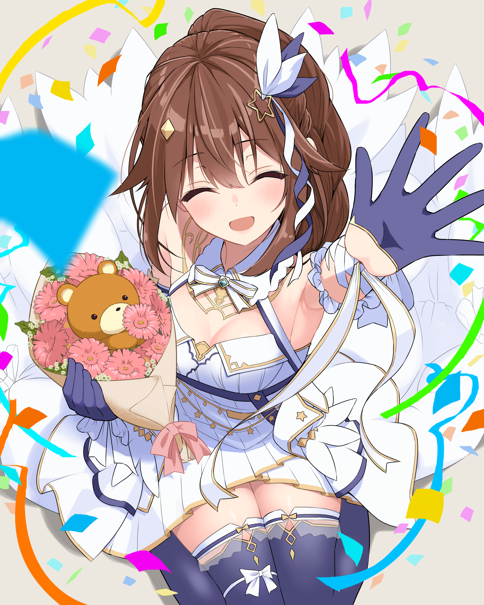 1girl ankimo_(tokino_sora) arm_up armpits bare_shoulders blush breasts brown_hair cleavage closed_eyes confetti diamond_hair_ornament dress flower gloves hair_flaps hair_ornament highres hololive kuronaga long_hair medium_breasts open_mouth ponytail small_breasts solo star_(symbol) star_hair_ornament thighhighs tokino_sora tokino_sora_(birthday_2022) virtual_youtuber