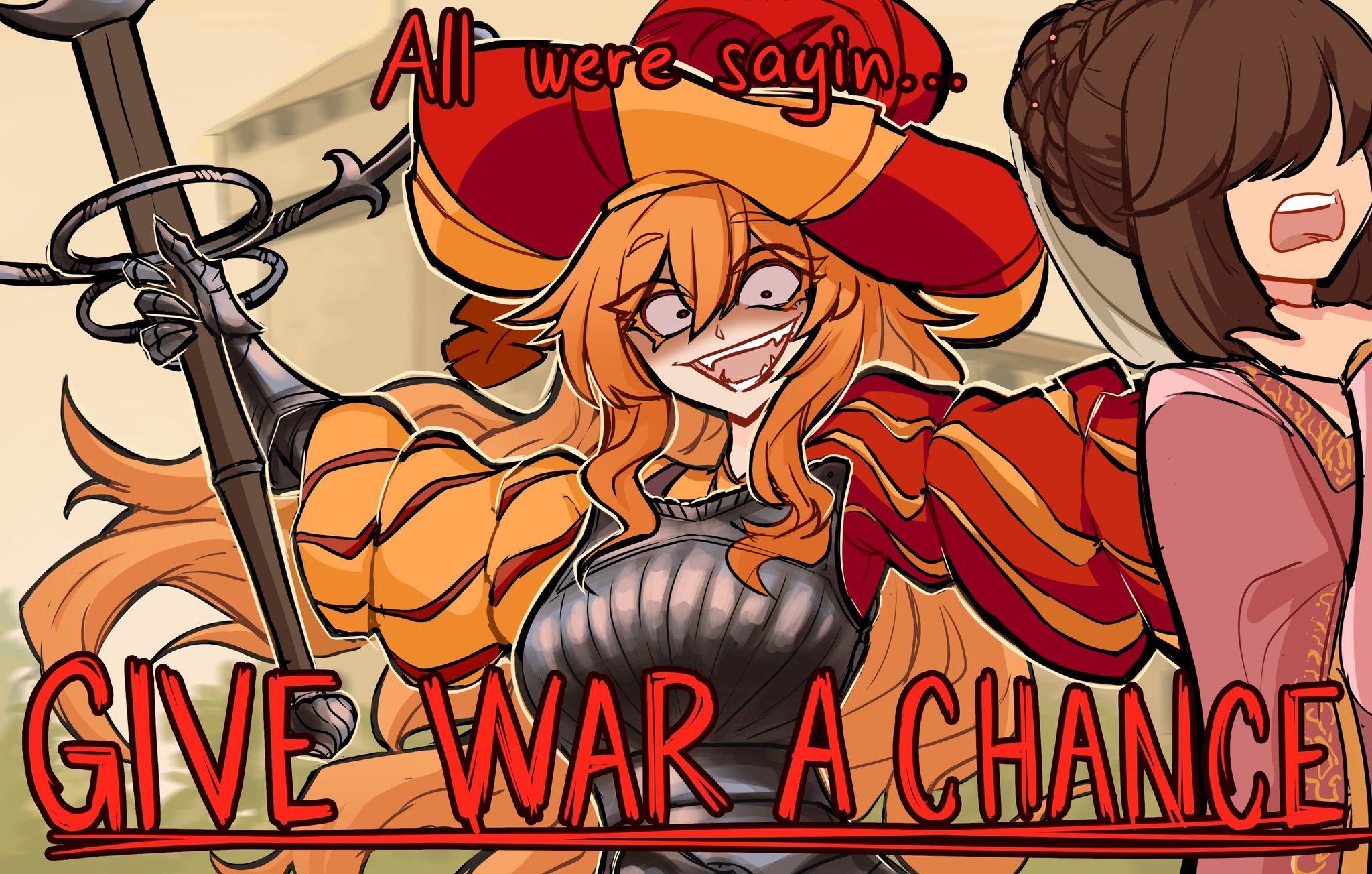 2girls armor braid breastplate brown_hair centurii-chan colored_eyelashes commentary constricted_pupils covered_eyes crazy_eyes dress english_commentary english_text fangs french_braid gauntlets hat highres holding holding_sword holding_weapon landsknecht_(centurii-chan) long_hair medieval meme metal_gear_(series) metal_gear_rising:_revengeance multiple_girls open_mouth orange_hair original pink_dress puffy_sleeves sidelocks swept_bangs sword upper_body very_long_hair weapon wide-eyed wide_sleeves zweihander