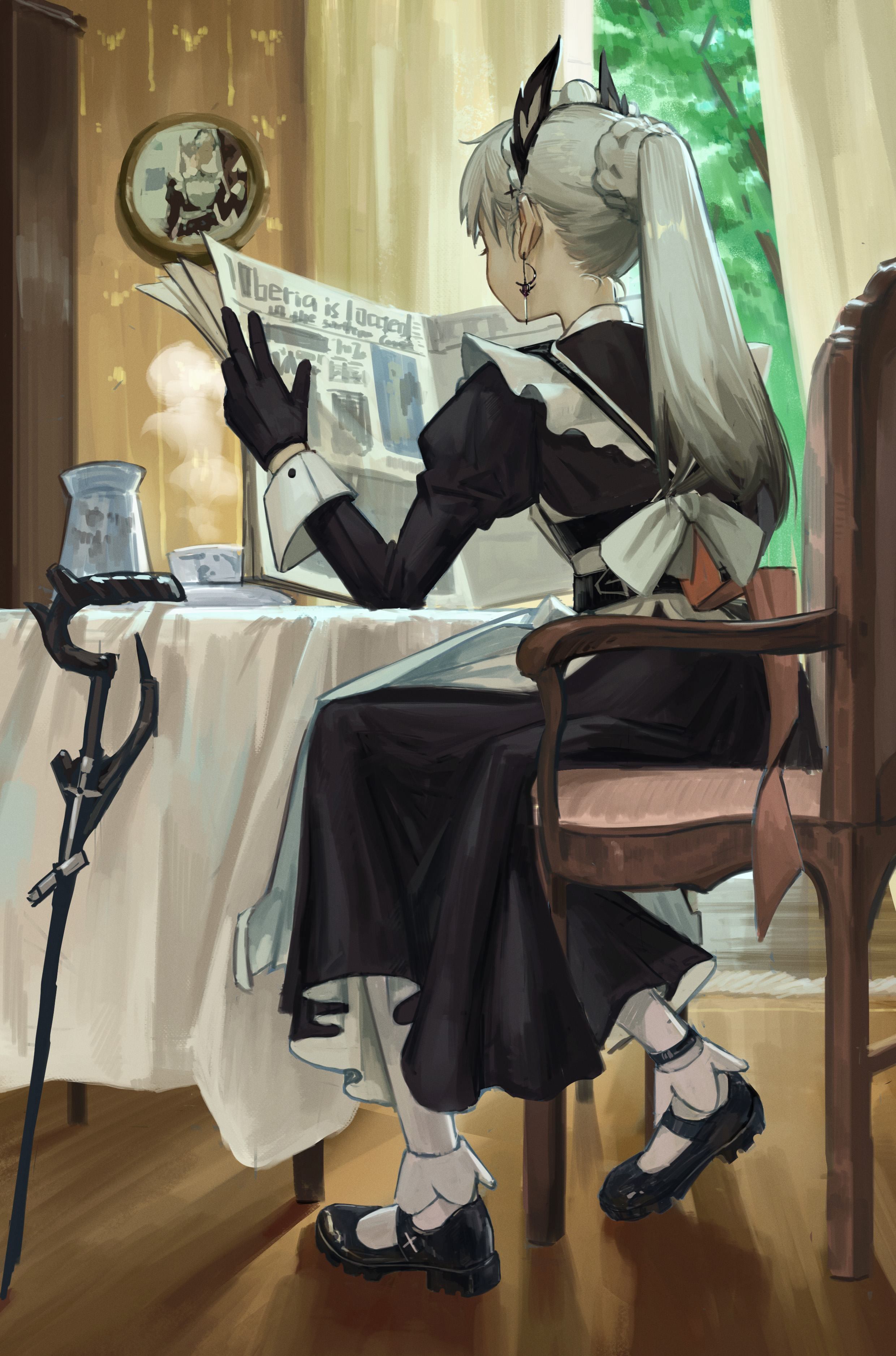 1girl absurdres apron arknights back_bow black_dress black_gloves black_shoes bow braid cane chair commentary curtains dress earrings from_behind gloves grey_hair head_wings highres holding holding_newspaper indoors irene_(arknights) irene_(voyage_of_feathers)_(arknights) jewelry juliet_sleeves long_sleeves maid maid_apron newspaper official_alternate_costume pantyhose peach21 ponytail portrait_(object) puffy_sleeves reading shoes sitting sleeve_cuffs slice_of_life solo untranslatable_commentary wardrobe white_apron white_bow white_pantyhose wings