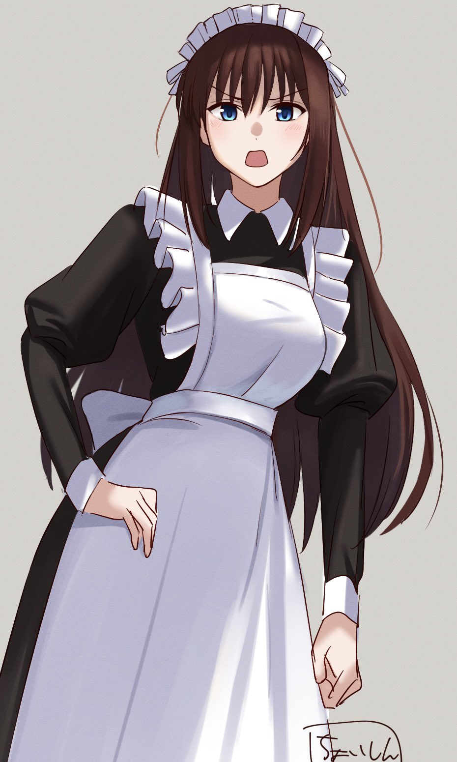 1girl alternate_costume aozaki_aoko apron black_dress blue_eyes blush brown_hair commentary_request dress enmaided grey_background hand_on_own_hip highres juliet_sleeves long_hair long_sleeves looking_at_viewer mahou_tsukai_no_yoru maid maid_apron maid_headdress puffy_sleeves shintyoi2 simple_background solo white_apron