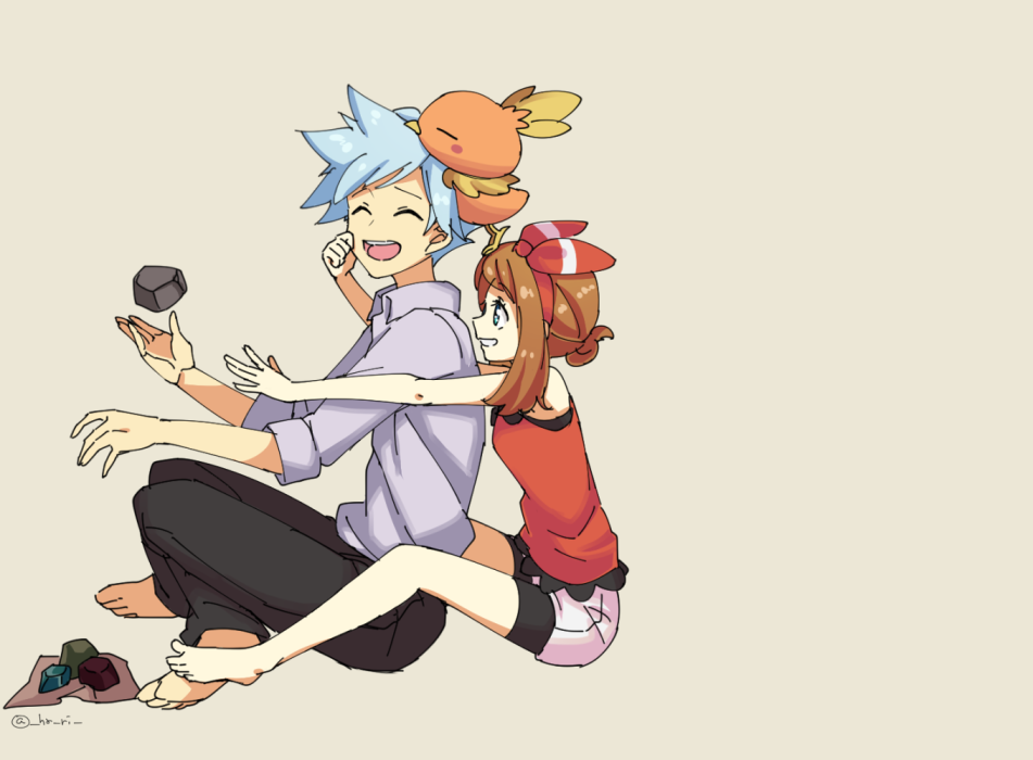 1boy 1girl bare_shoulders barefoot black_pants blue_hair bow brown_hair cheek_pinching closed_eyes collared_shirt full_body gen_3_pokemon hair_bow hari611 long_sleeves may_(pokemon) nintendo open_mouth pants pinching pokemon pokemon_(creature) pokemon_omega_ruby_and_alpha_sapphire red_shirt rock shirt shorts sleeveless sleeveless_shirt smile steven_stone teeth torchic upper_teeth_only white_shorts