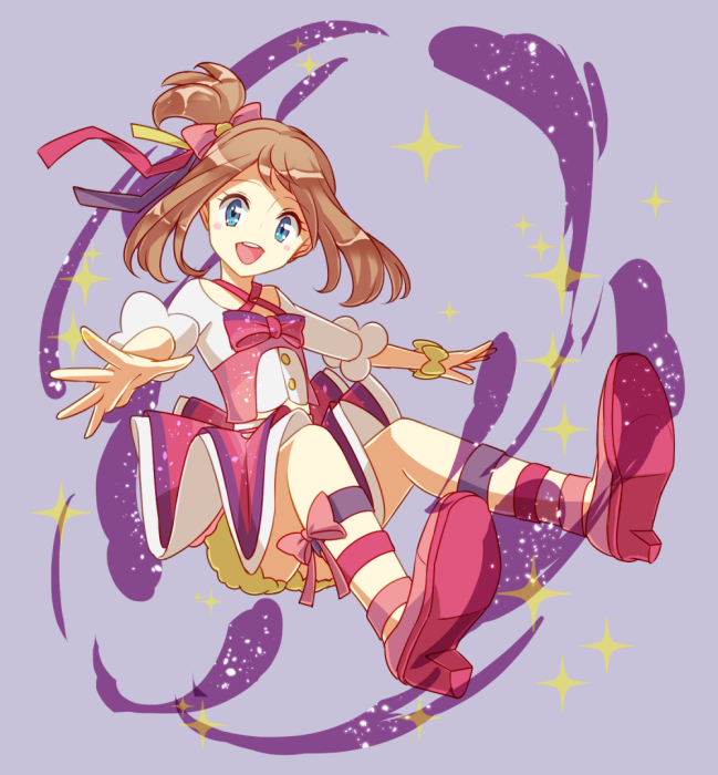1girl anklet blue_eyes bow brown_hair full_body hair_bow hair_ribbon hari611 idol jewelry looking_at_viewer may_(contest)_(pokemon) may_(pokemon) nintendo official_alternate_costume official_alternate_hairstyle open_mouth pink_bow pink_ribbon pink_shoes pokemon pokemon_omega_ruby_and_alpha_sapphire purple_ribbon ribbon shirt shoes skirt solo teeth upper_teeth_only white_shirt yellow_ribbon