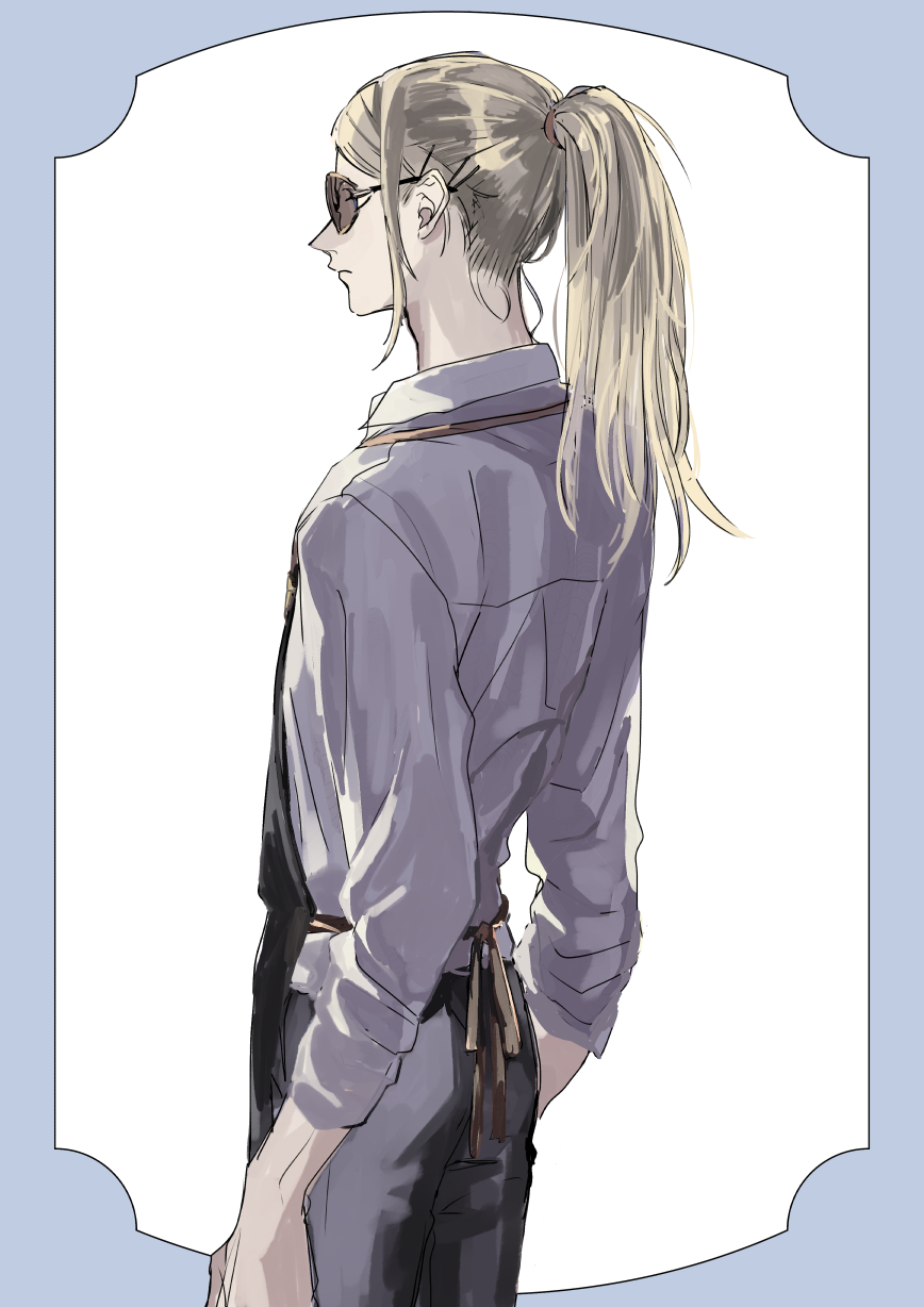 apron black_apron black_pants blonde_hair blue_eyes brown_scrunchie fate/grand_order fate_(series) from_behind highres long_hair male_focus pants ponytail riku_gotaro scrunchie shirt simple_background sleeves_rolled_up sunglasses tezcatlipoca_(fate) white_background white_shirt
