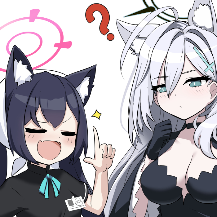 2girls :d ahoge animal_ear_fluff animal_ears black_choker black_dress black_gloves black_hair blue_archive blue_eyes breasts broken_halo cat_ears cat_girl choker cleavage closed_eyes commentary_request dress gloves grey_hair hair_between_eyes halo id_card index_finger_raised large_breasts long_hair long_sleeves looking_at_another medium_breasts multiple_girls official_alternate_costume open_mouth serika_(blue_archive) serika_(waitress)_(blue_archive) shiroko_terror_(blue_archive) shooka short_sleeves sidelocks simple_background small_breasts smile twintails waitress white_background white_headwear wide_sleeves wolf_ears wolf_girl