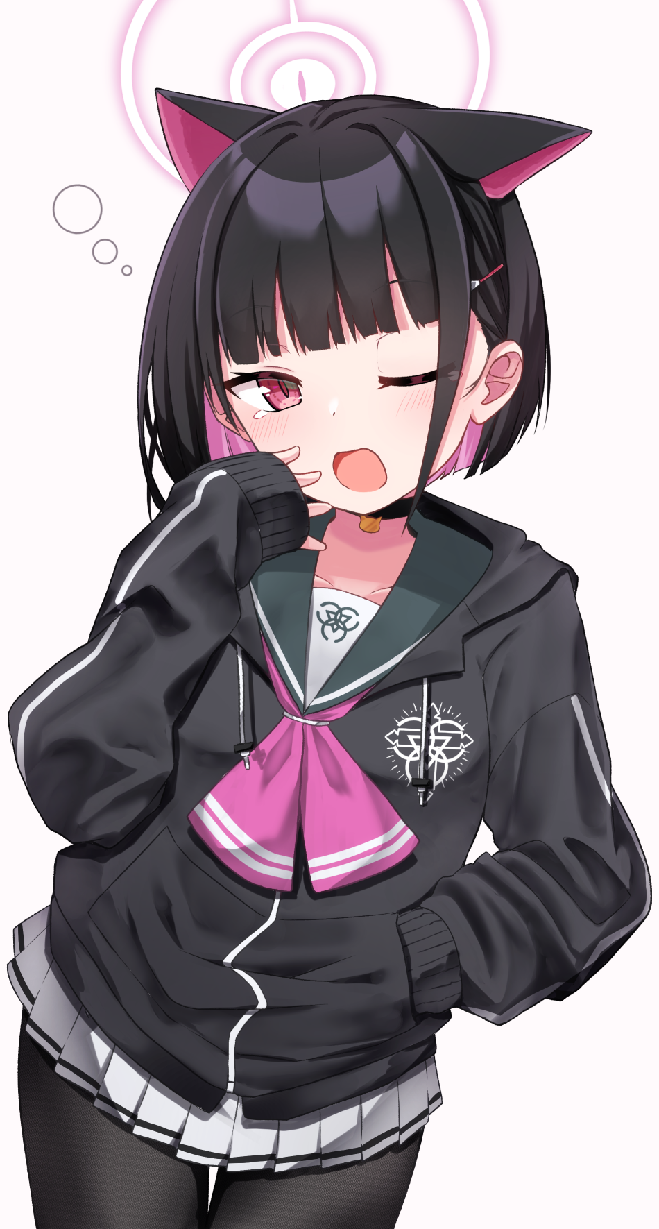 1girl animal_ears black_hair black_jacket black_pantyhose blue_archive blush commentary_request drawstring grey_background halo hand_up highres hood hood_down hooded_jacket jacket kazusa_(blue_archive) long_sleeves looking_at_viewer multicolored_hair nenosame one_eye_closed pantyhose pink_hair pleated_skirt puffy_long_sleeves puffy_sleeves red_eyes simple_background skirt sleeves_past_wrists solo tears two-tone_hair white_skirt yawning