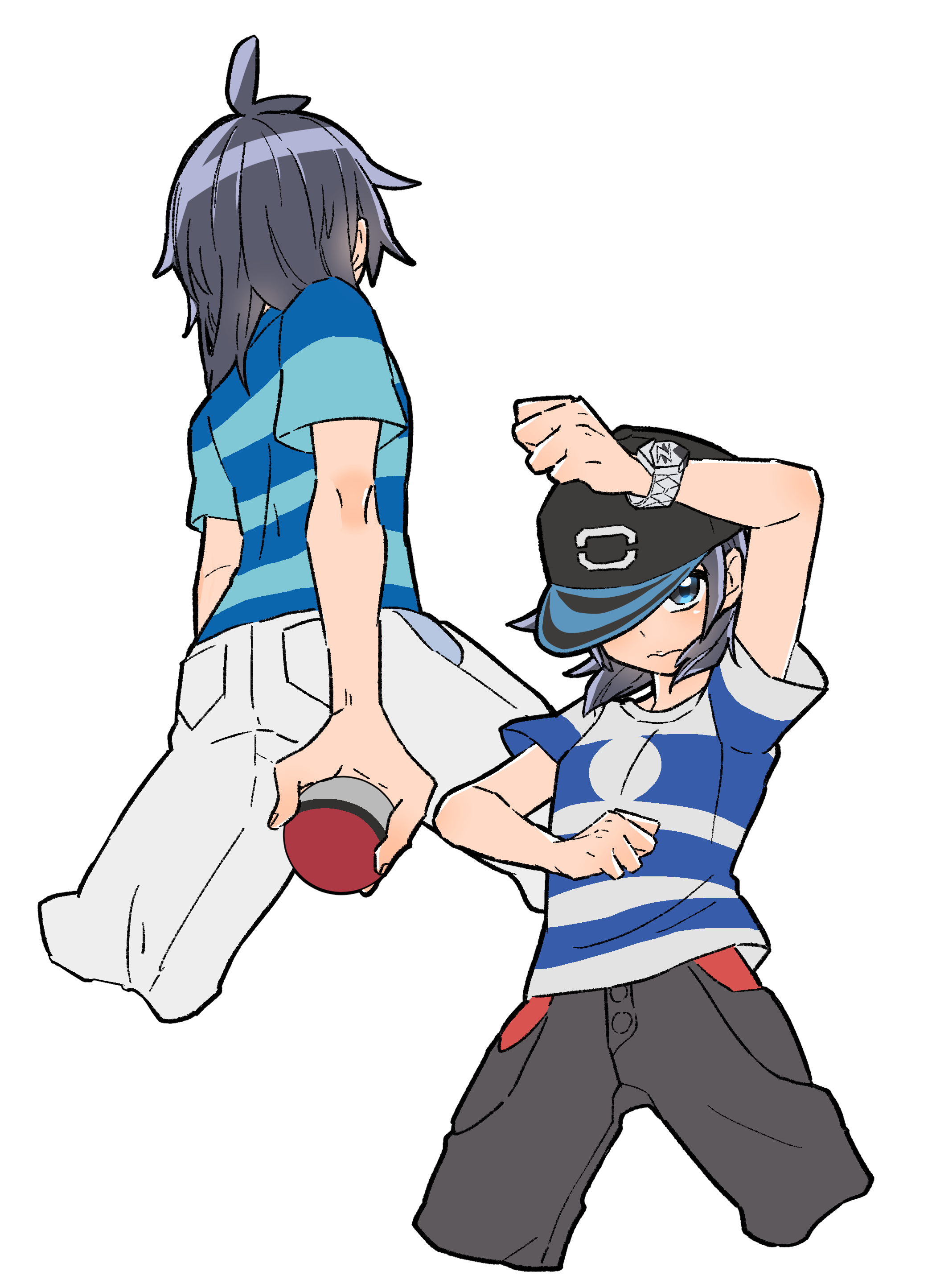 1boy absurdres alternate_color baseball_cap black_hair black_headwear blue_eyes cropped_legs elio_(pokemon) hat highres holding holding_poke_ball male_focus multiple_views nintendo po_posan poke_ball poke_ball_(basic) pokemon pokemon_masters_ex pokemon_sun_and_moon shirt simple_background white_background z-ring